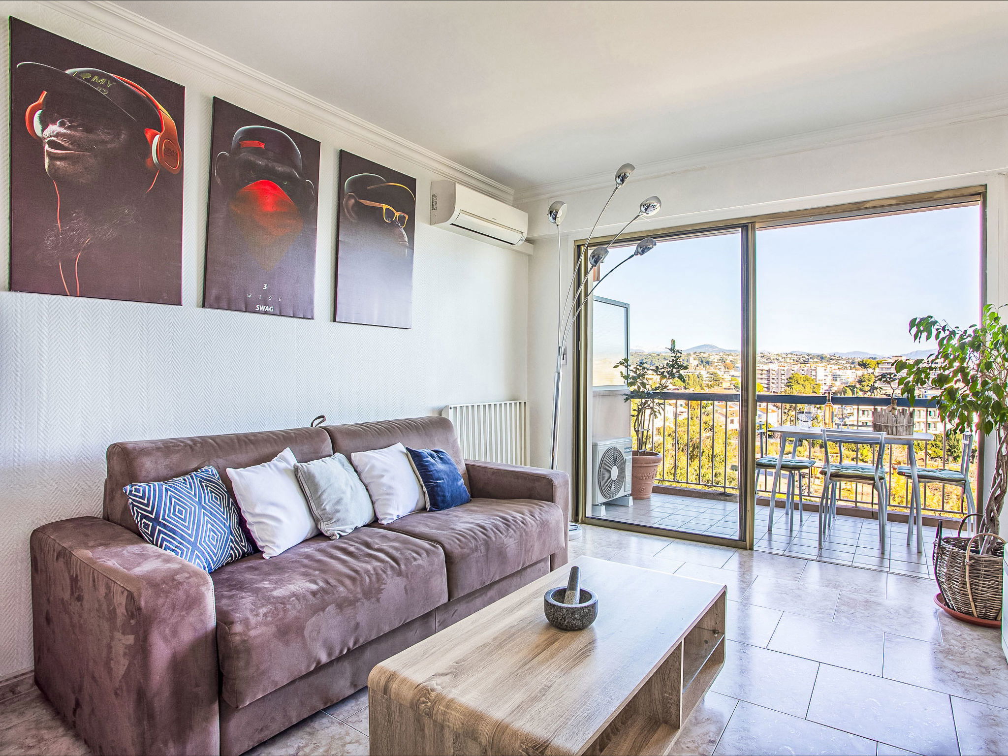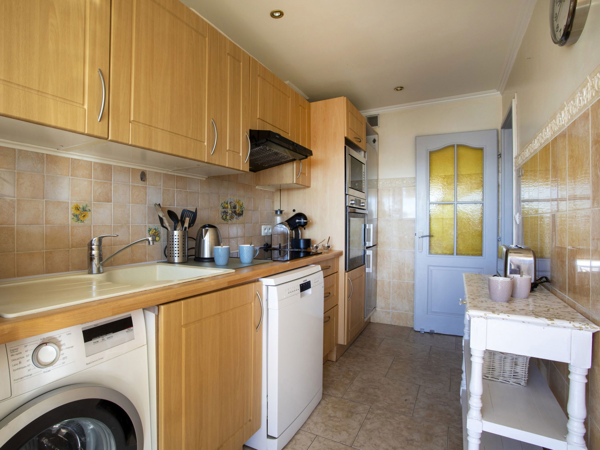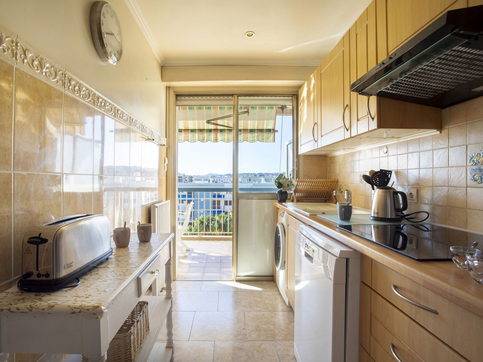 2-room apartment 50 m2 on 5th floor. Comfortable furnishings: living/dining room with 1 double sofabed (1 x 140 cm, length 190 cm), air conditioning. Exit to the terrace. 1 room with 1 french bed (1 x 160 cm, length 200 cm). Exit to the terrace. Kitchen (3 hot plates, oven, dishwasher, toaster, kettle, microwave, freezer, electric coffee machine). Exit to the terrace. Bathroom, sep. WC. Heating. Balcony 8 m2, south facing position and, east facing position, terrace 12 m2, north facing position. Balcony furniture. Beautiful view of the sea and the mountains. Facilities: washing machine, iron, hair dryer. Internet (WiFi, free). Parking (1 car). Please note: non-smoking house. Smoke alarm. Offer by a private individual according to Art. 155, IV of CGI. 06027034259WF