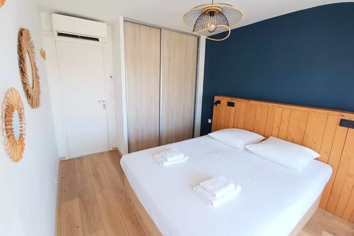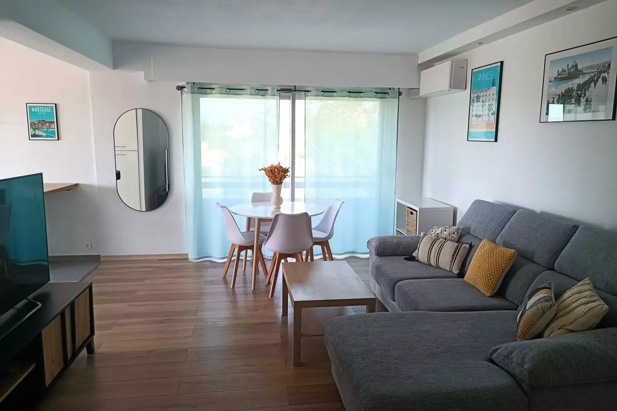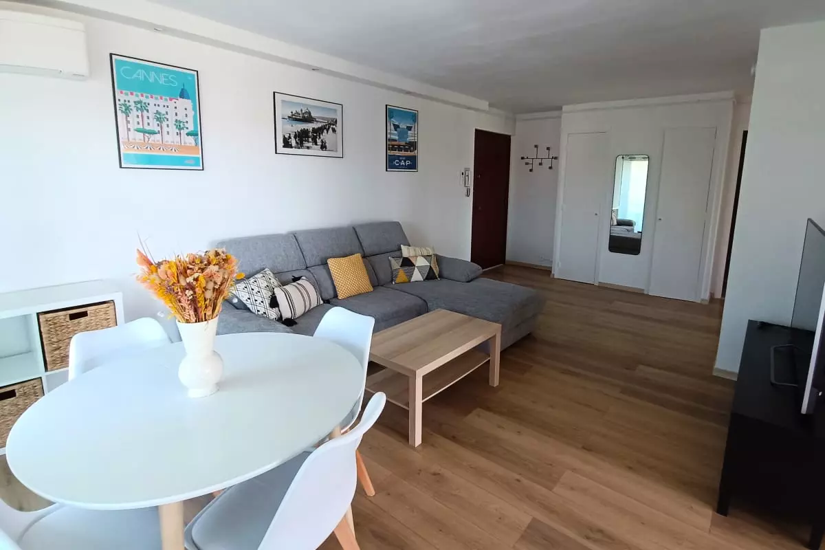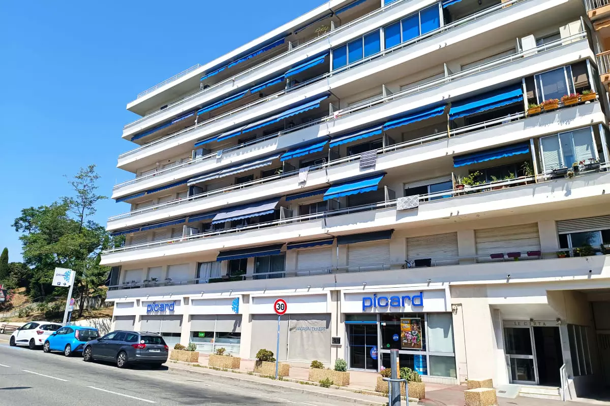 With an area of 60 m², air-conditioned, it includes 2 bedrooms with several storage spaces, a private parking space, a lovely corner balcony with a glimpse of the sea and overlooking the castle of Cagnes and can accommodate up to 5 people.
