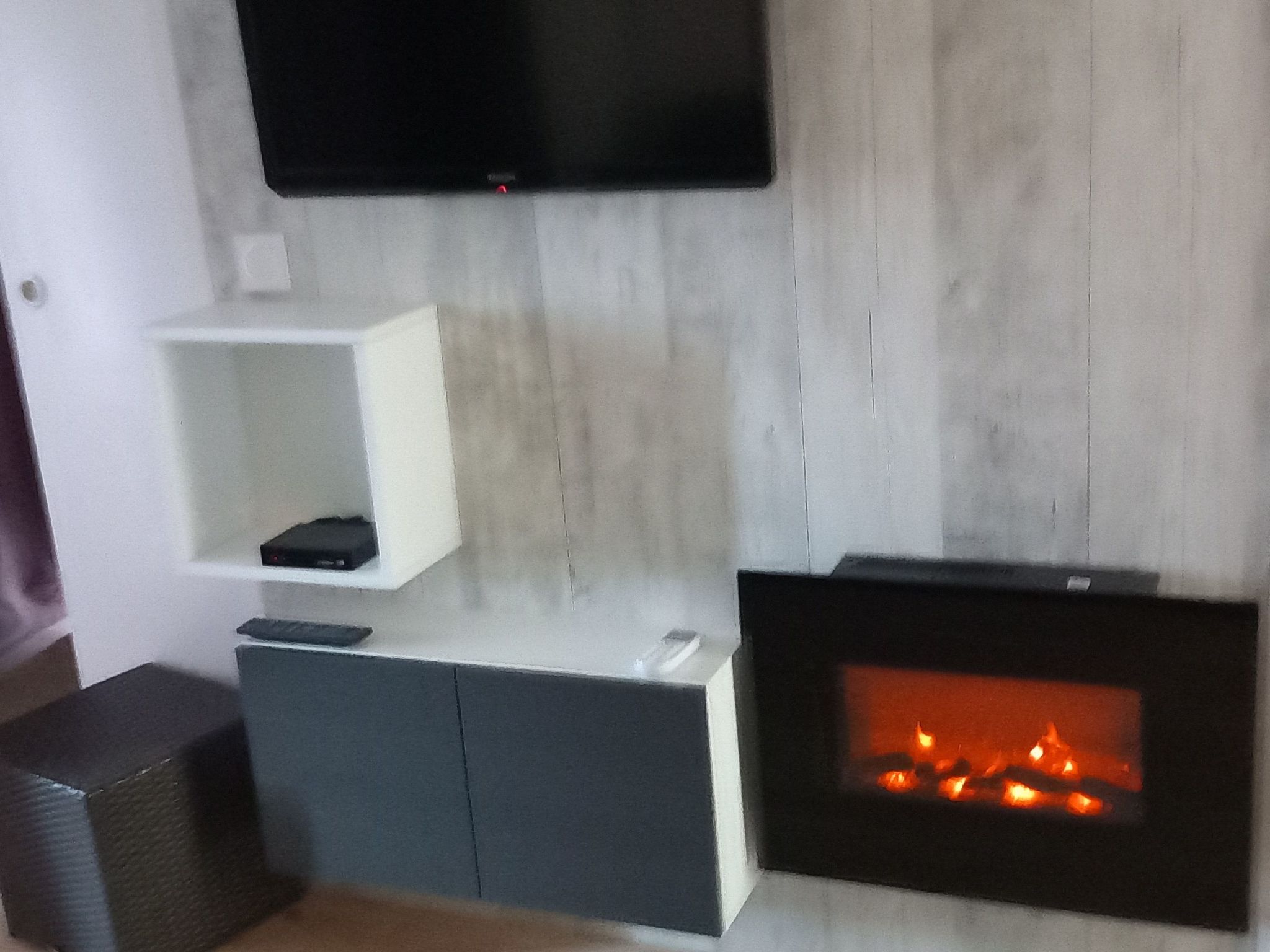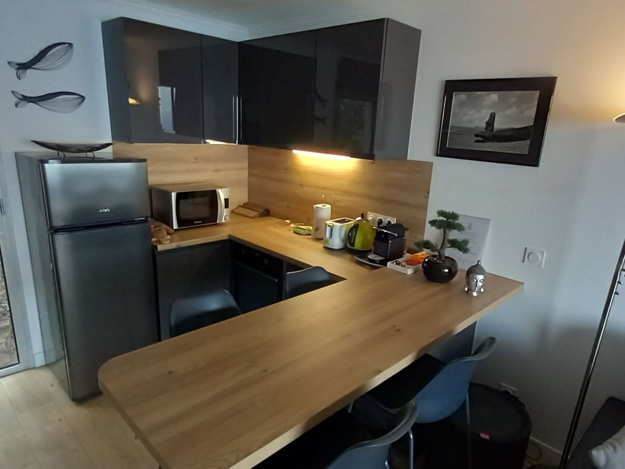 Un salon avec canapé convertible 2 places TV DVD et mini chaîne, une chambre avec un lit 2 places, une cuisine aménagée avec tous les accessoires indispensables, table induction, four, four micro onde, cafetière, lave-vaisselle, une salle de bains avec baignoire, un petit coffre.
