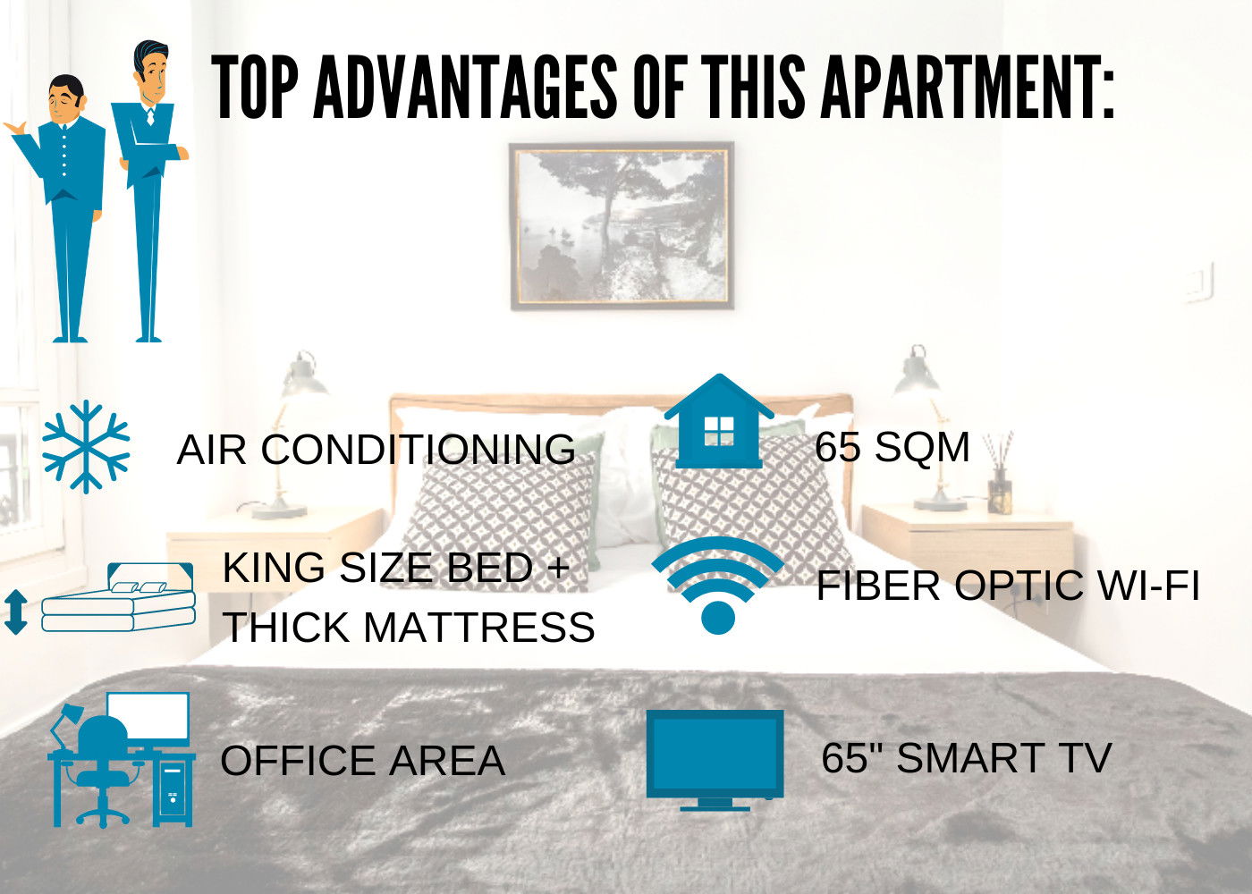 The apartment has modern decoration. The white walls and furniture accentuate the brightness in the apartment due to its southern exposure. The light parquet and the wooden furniture provide warmth for a cozy atmosphere. You will enjoy the large sofa where you can relax while watching a series on your Netflix account. The king size double bed with a soft and thick mattress of 30 centimeters will be your ideal companion for rejuvenating nights.