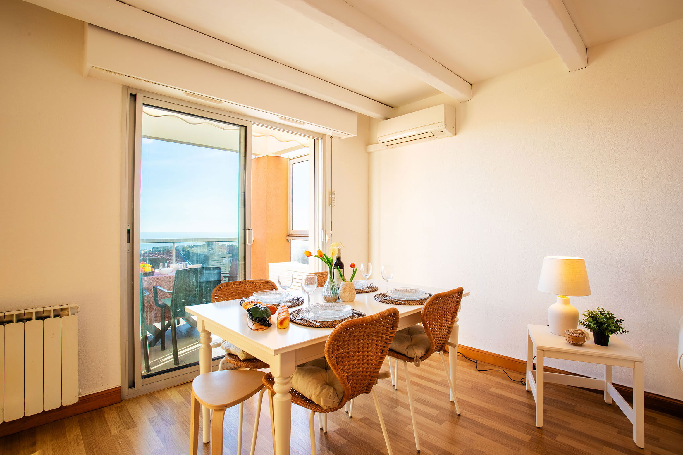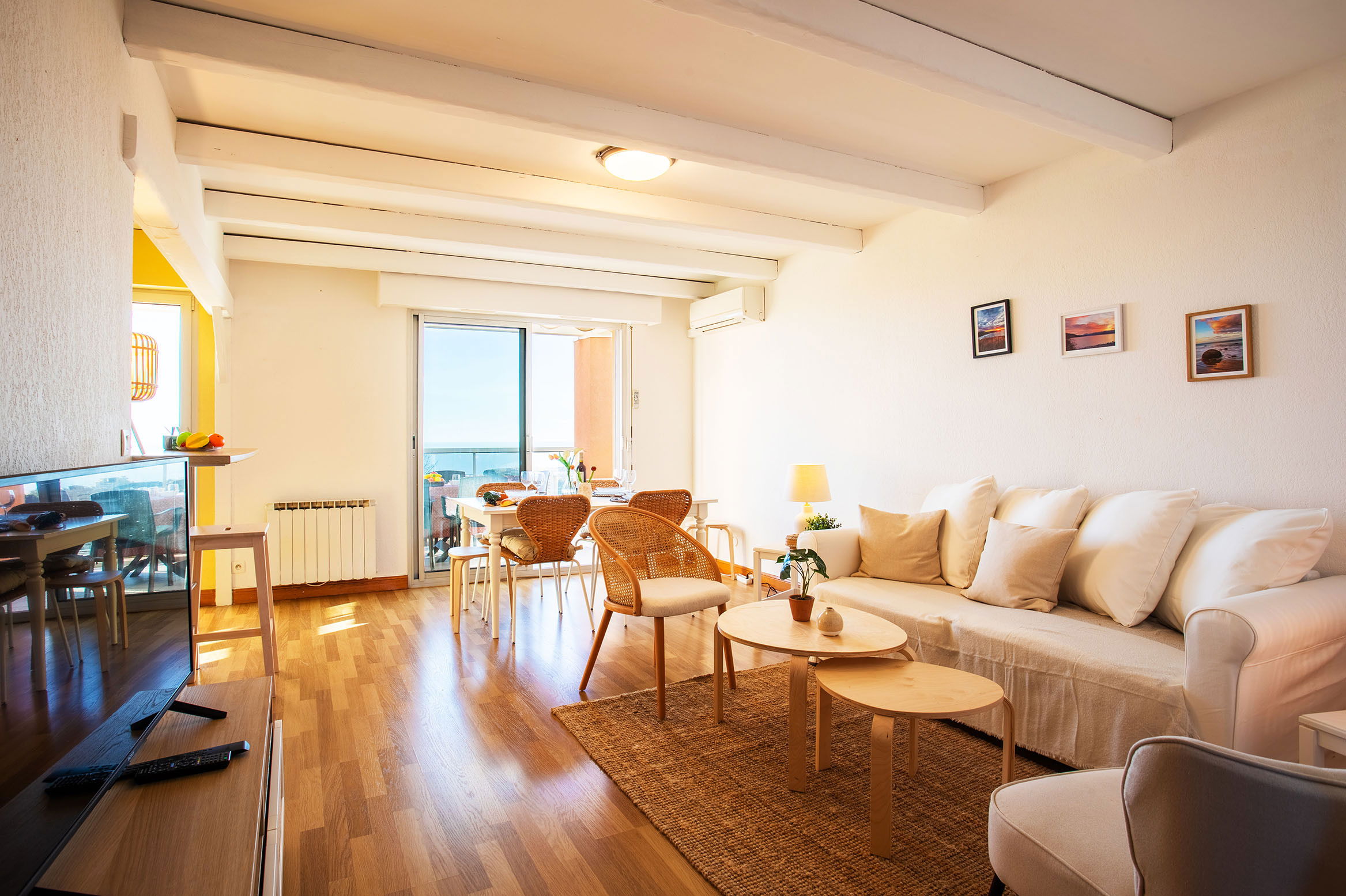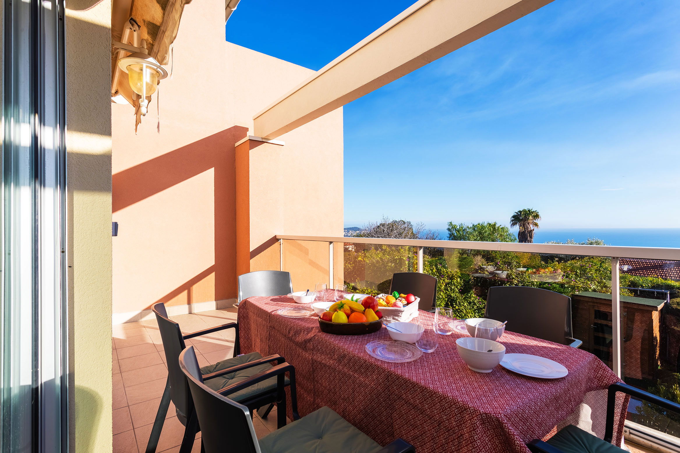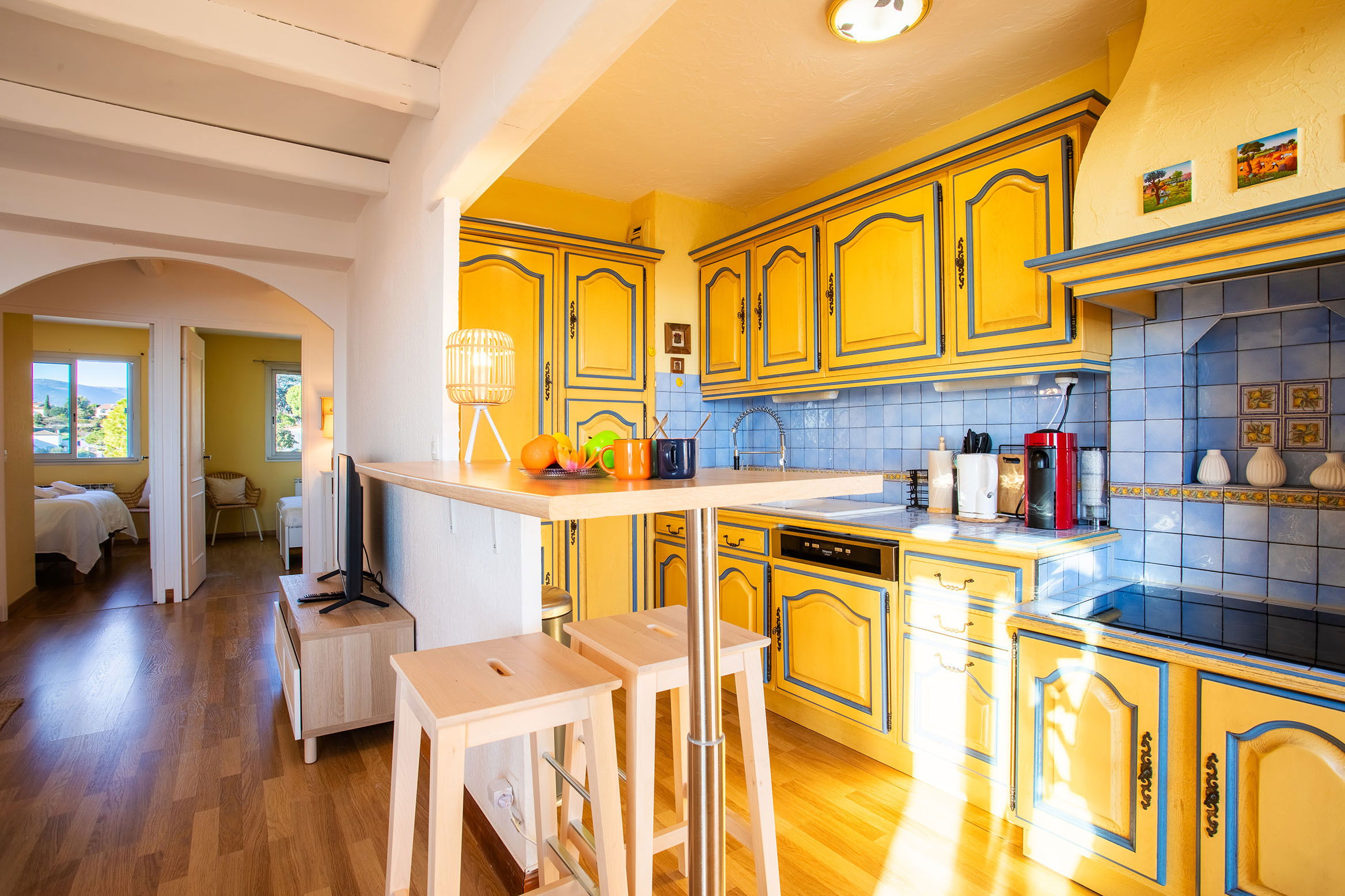 A living / dining room with fully equipped open kitchen opening onto a balcony equipped with a table and chairs with a beautiful view of the hills and the sea