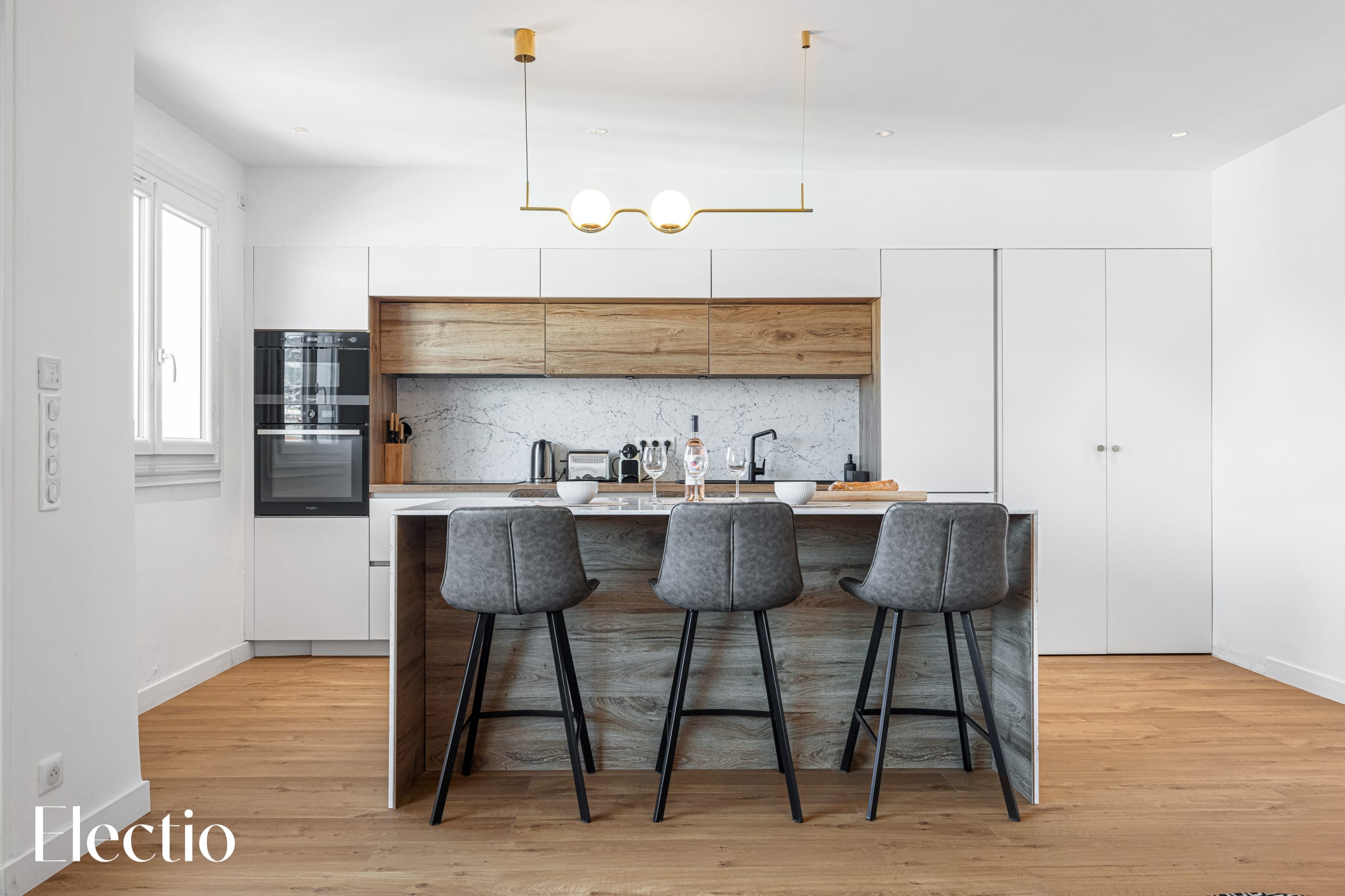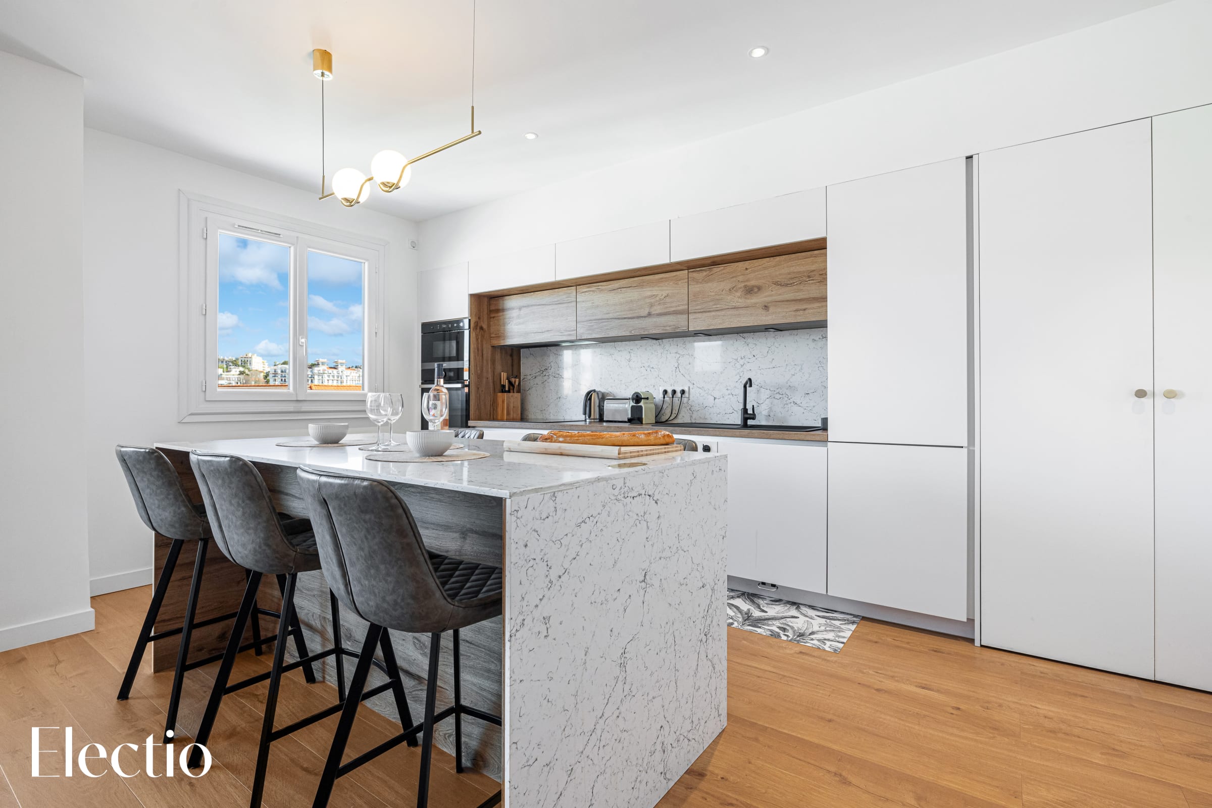 The kitchen, elegantly decorated with wood and quartz, is equipped with everything needed to cook local delicacies, featuring a central island perfect for sharing convivial moments. Equipped with an oven, a microwave, an induction hob with extractor hood, a sink incorporating a dishwasher, and a fridge-freezer, it is perfect for meals with family or friends.