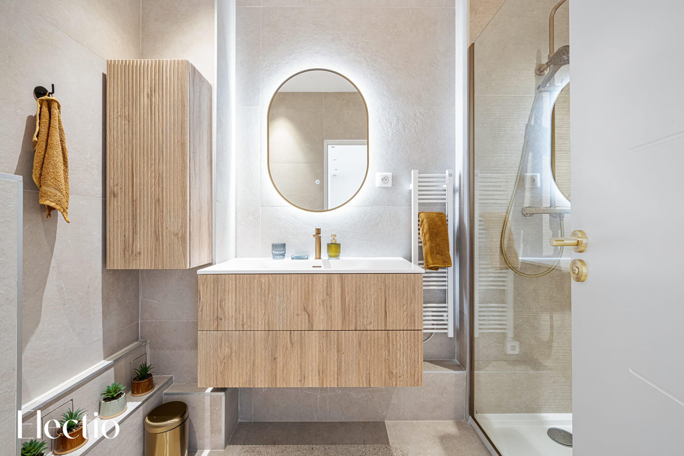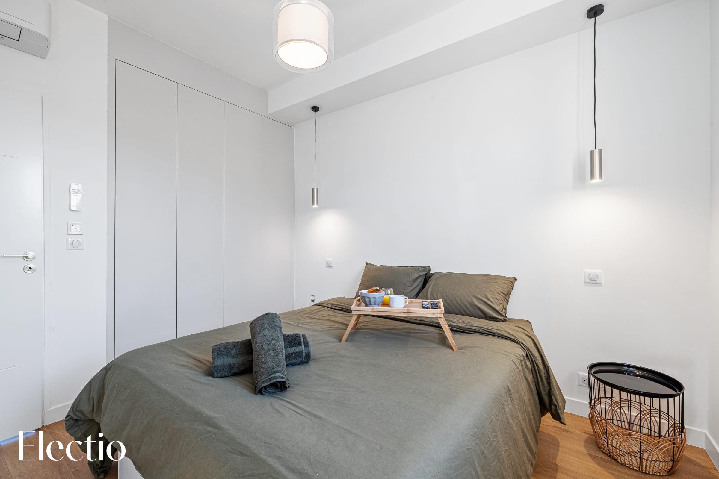 The bedroom offers a haven of peace with its 160 cm queen-size bed, flanked by two bedside tables and benefiting from suspended ambient lighting, as well as direct access to a private shower room, ensuring privacy and comfort, complemented by a wardrobe.