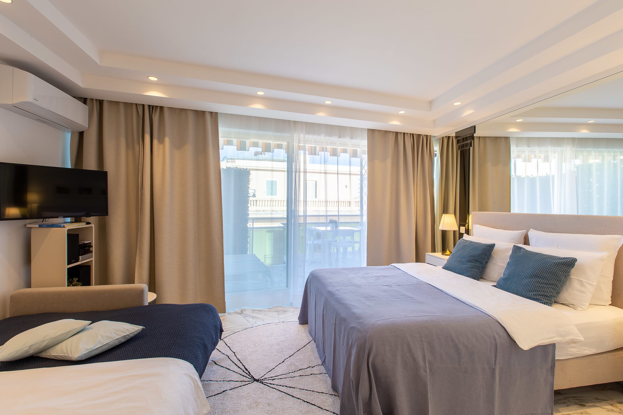 The residence “Royal Luxembourg” is situated at the beginning of the Promenade des Anglais facing the beach and is in the "Carré d’Or" of the center of Nice. It is found next to a semi-pedestrian zone surrounded by numerous boutiques, cafes and restaurants as well as supermarkets. This is the preferred area by vacationers in Nice. There are numerous bus stops in close proximity. The train station is a 20 minutes walk and the airport is 15 minutes by car but there is also a direct bus in immediate proximity, the n° 98.