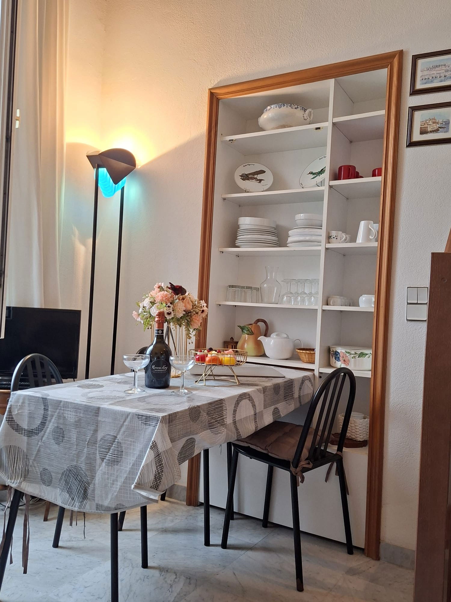 The functional kitchen, open to the living room, with refrigerator, cooking plates, microwave, extractor hood, kettle, toaster, coffee maker, and all necessary utensils for cooking and dining — all offering a superb view of the sea and Cap Ferrat.