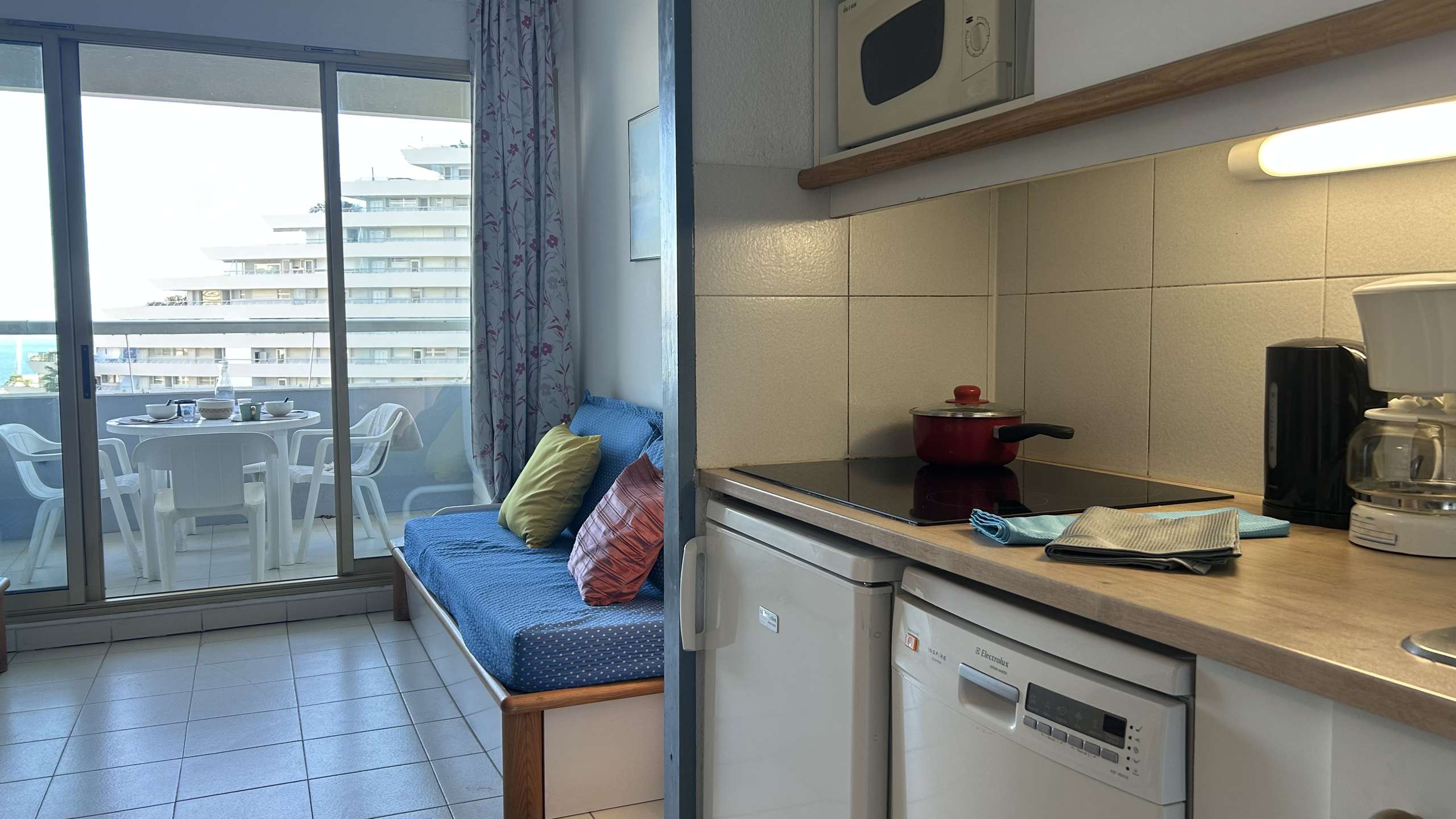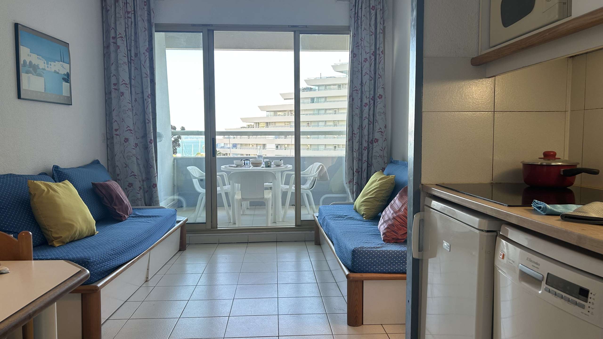 Villeneuve Loubet Plage (06) Le Baronnet Port Marina Baie des Anges Studio of approximately 24 m², 2 beds for up to 4 people. This Studio is located in the Residence Le Baronnet at the edge of the water with a sea view. It is composed at the entrance, a sleeping area with two bunk beds, a bathroom and toilet, in the main room you will find an equipped kitchenette. a washing machine, oven, two-burner hob with its dining area and two sofa beds opening onto a terrace with a view of the sea and gardens. End of stay cleaning included. Most of this accommodation: The apartment is pleasant and has a private parking lot.