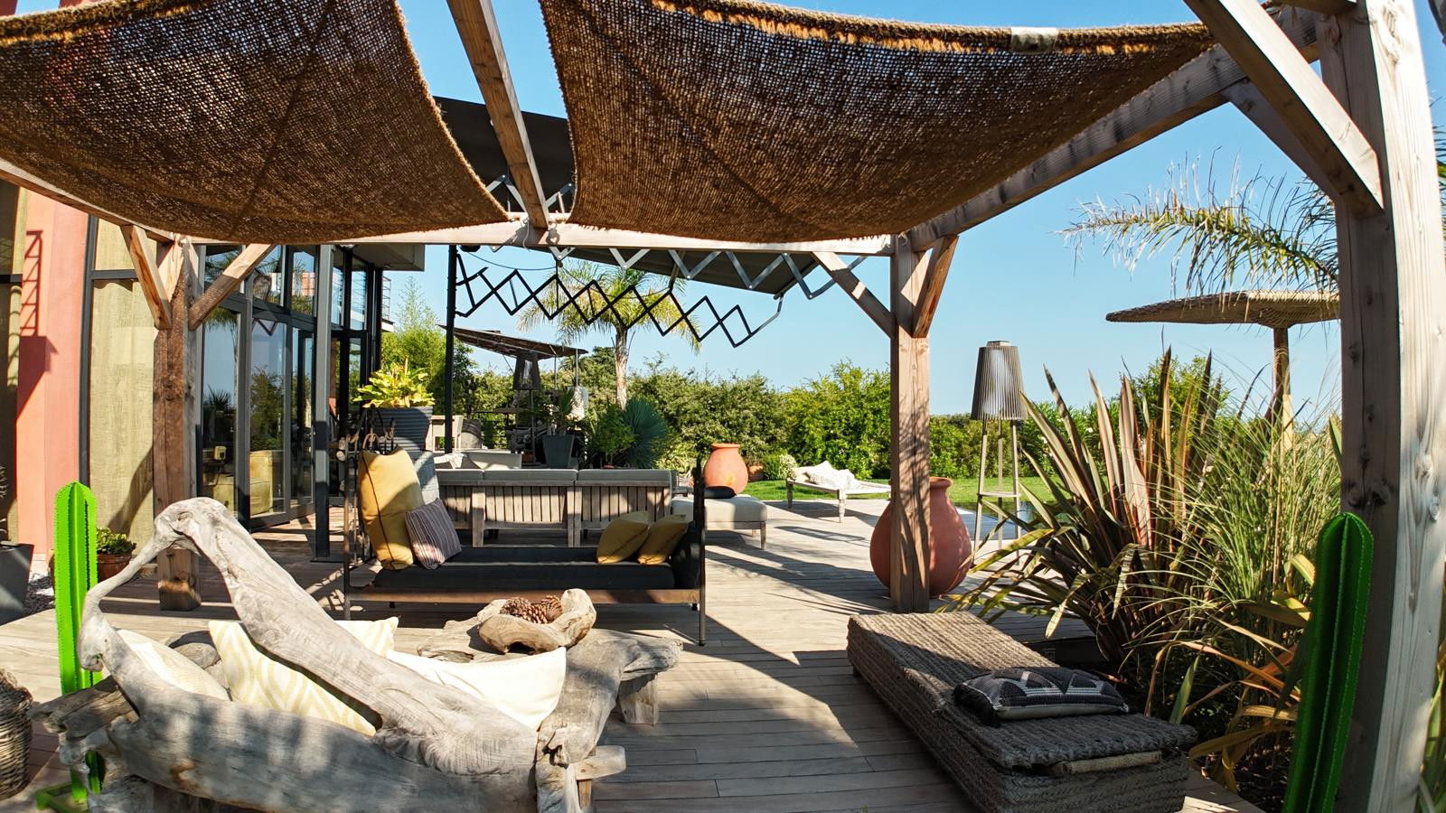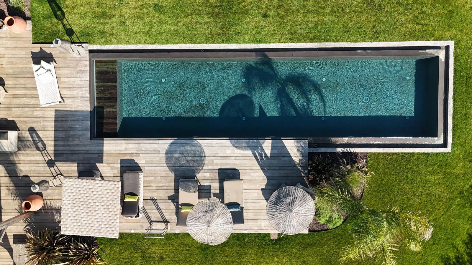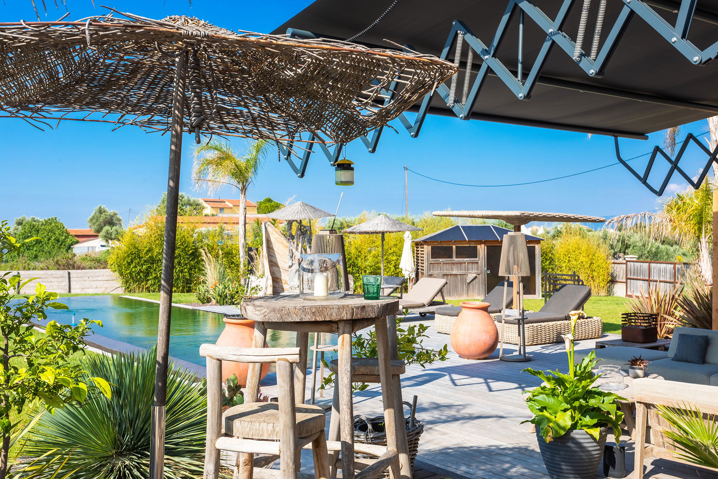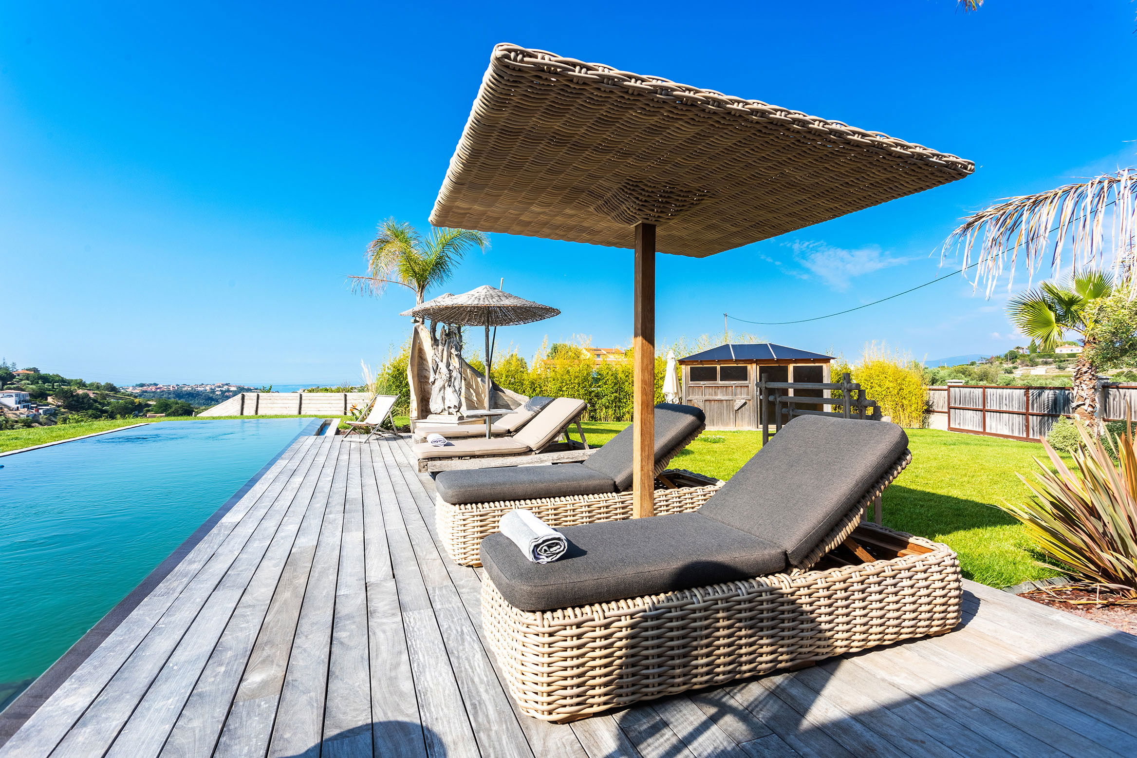 Teak terrace, garden, large plancha kitchen area, sink, wooden table for 10 people, chairs, parasols, deckchairs, aperitif cabin, ice machine, fridge and outdoor freezer,