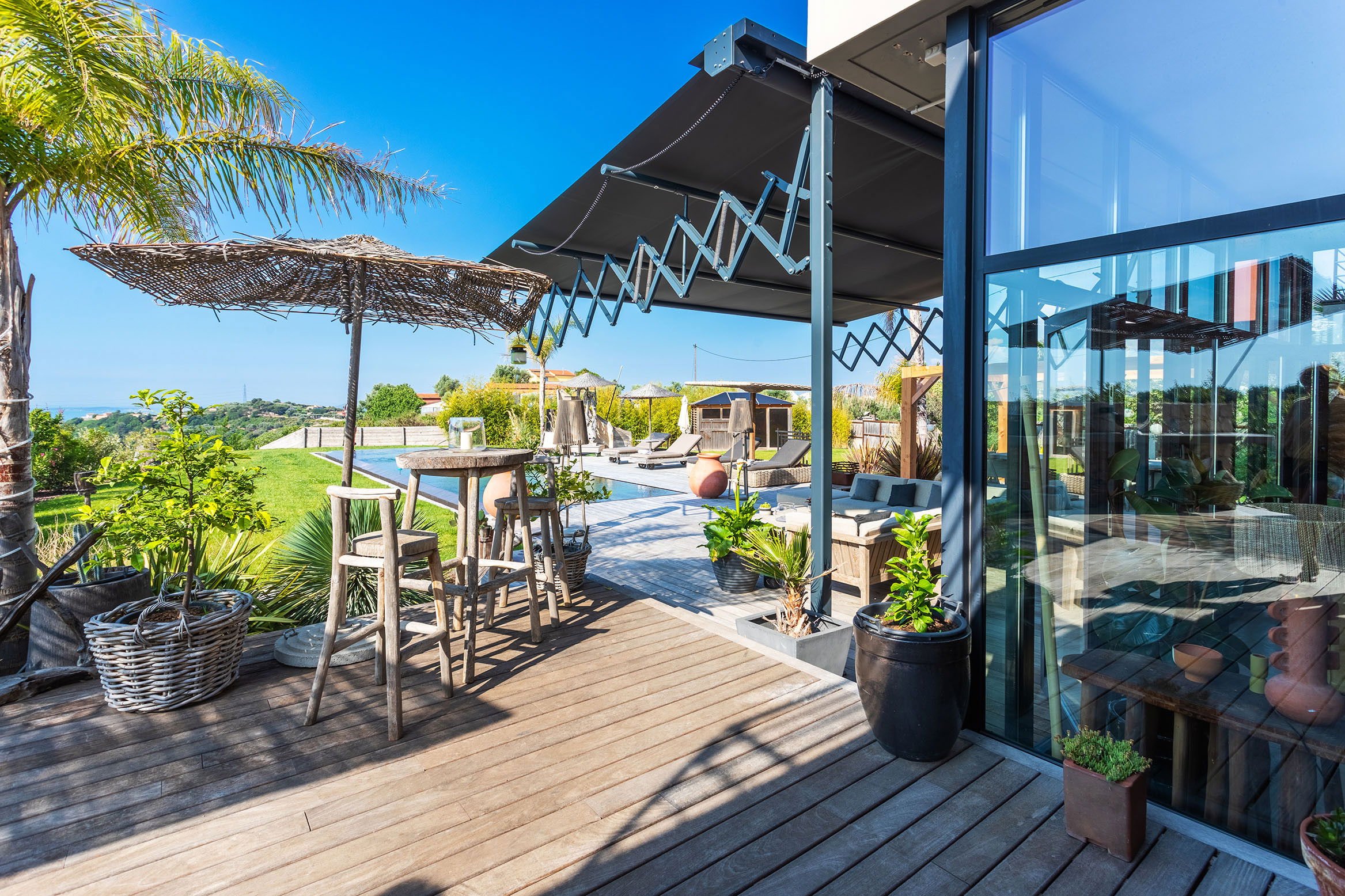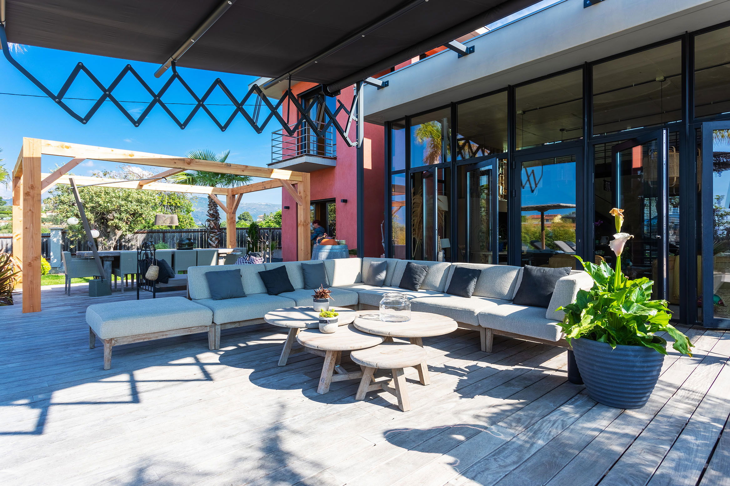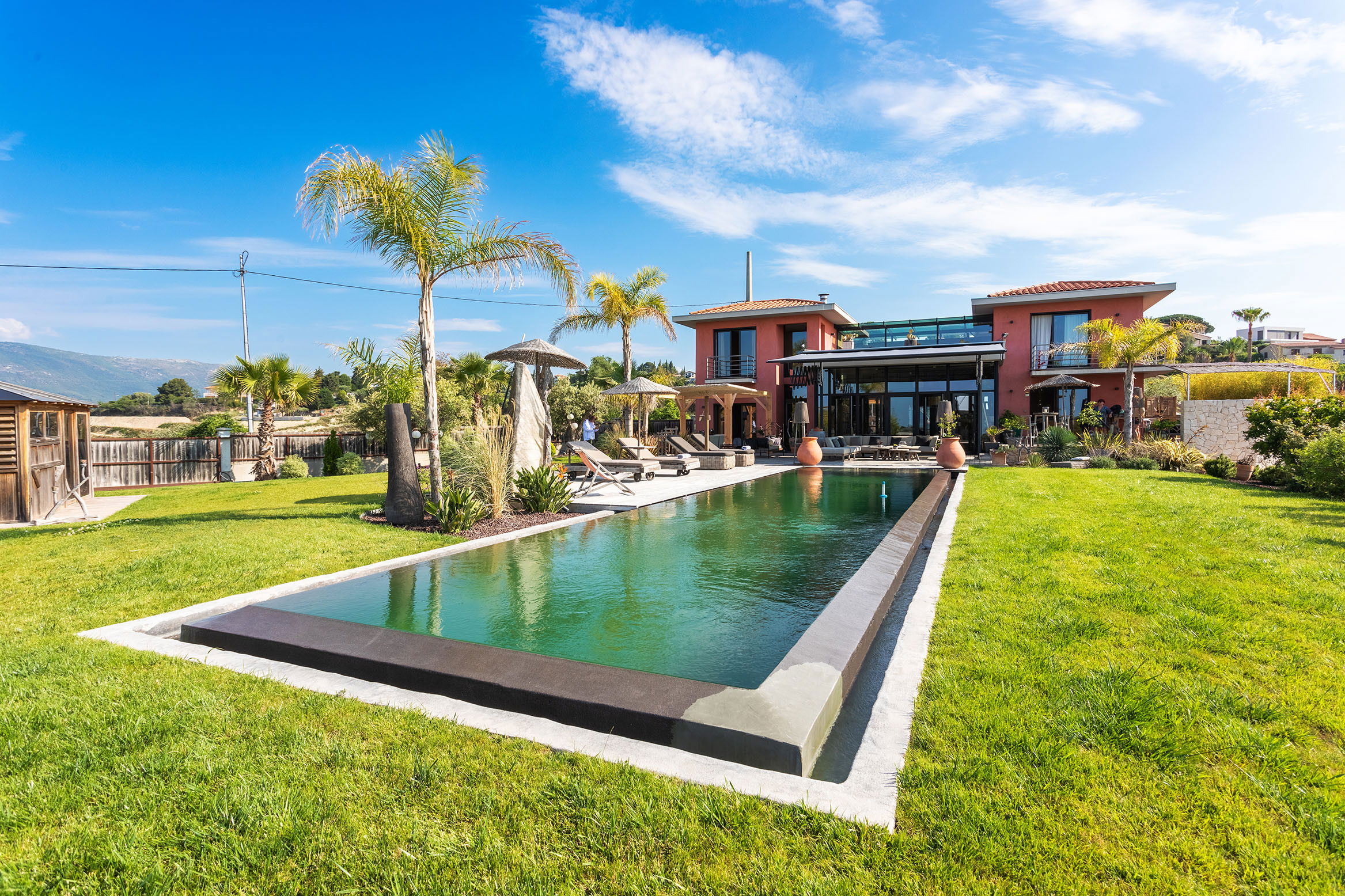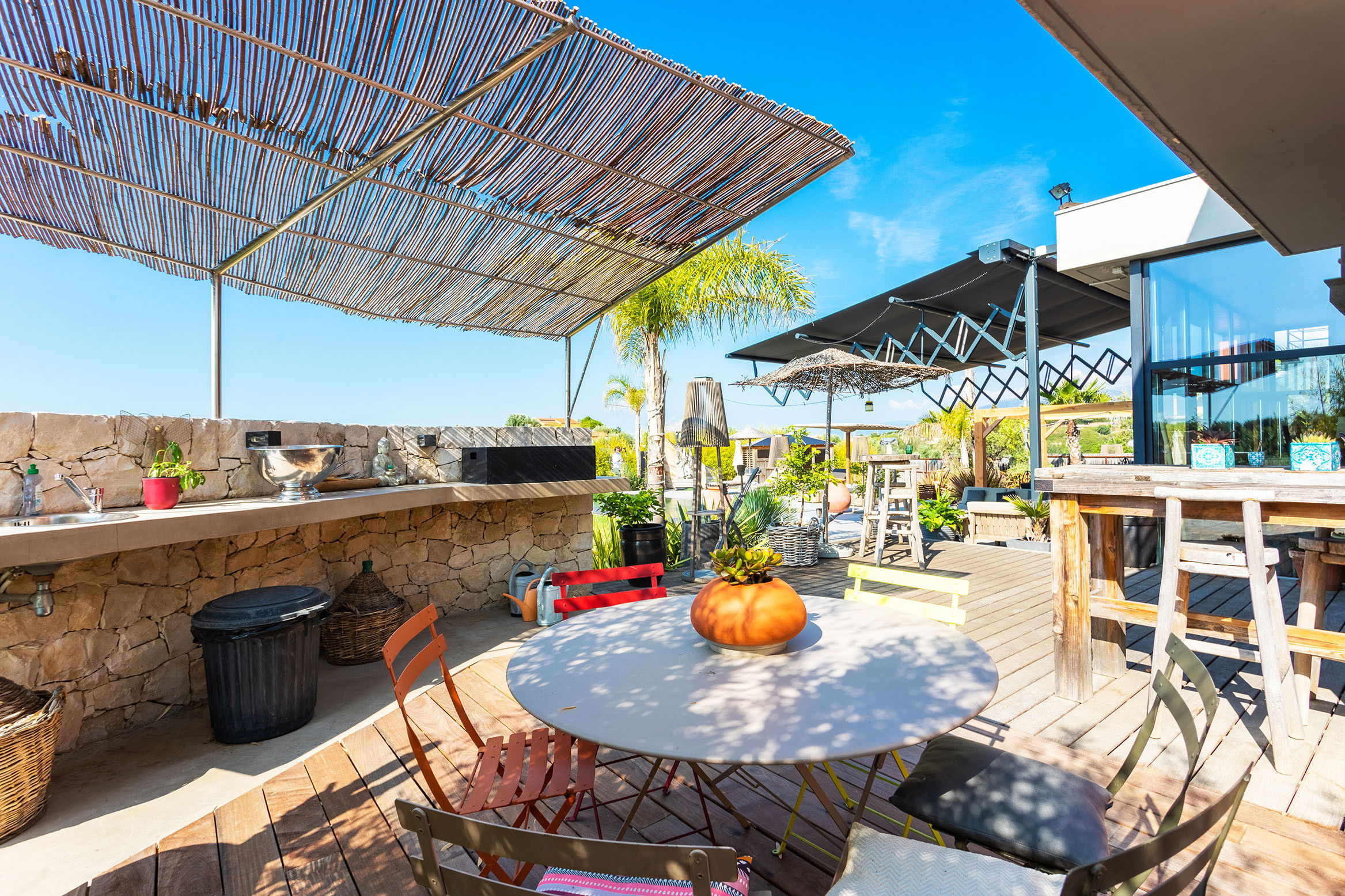 Teak terrace, garden, large plancha kitchen area, sink, wooden table for 10 people, chairs, parasols, deckchairs, aperitif cabin, ice machine, fridge and outdoor freezer,