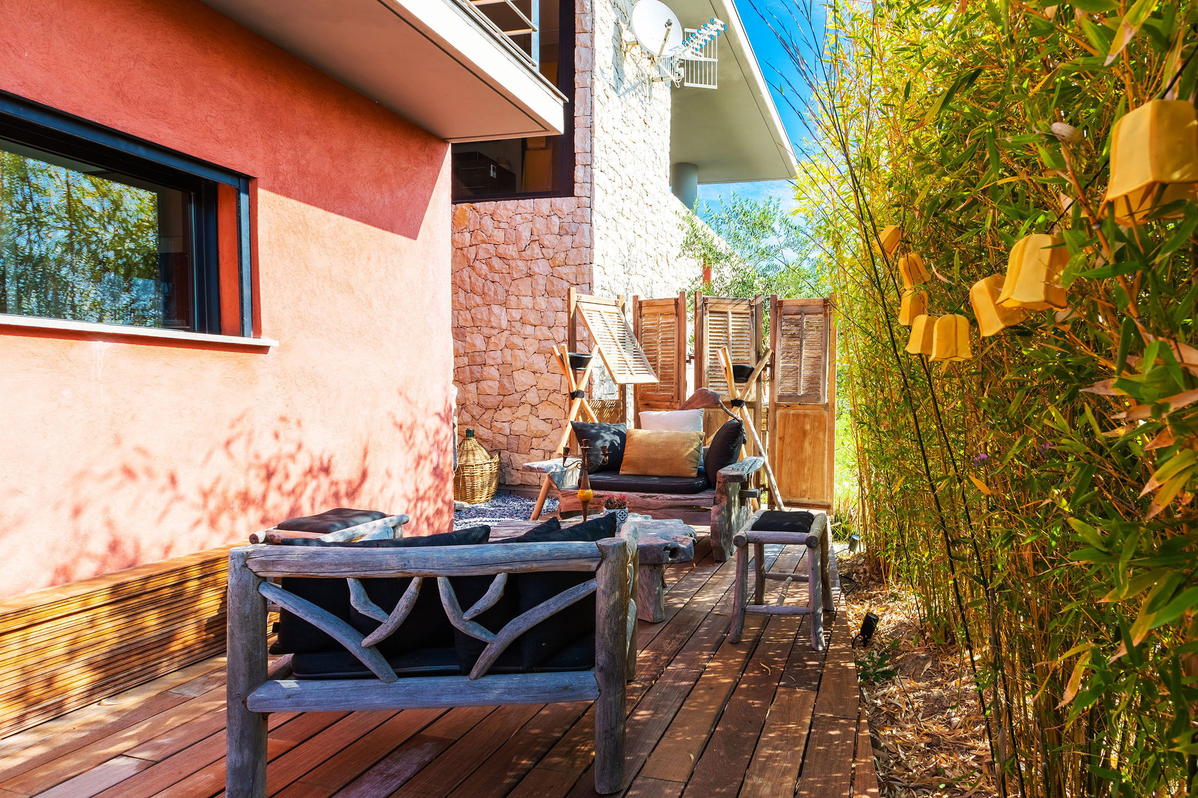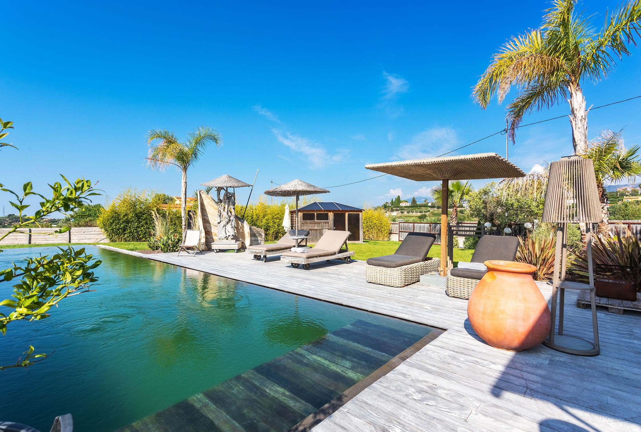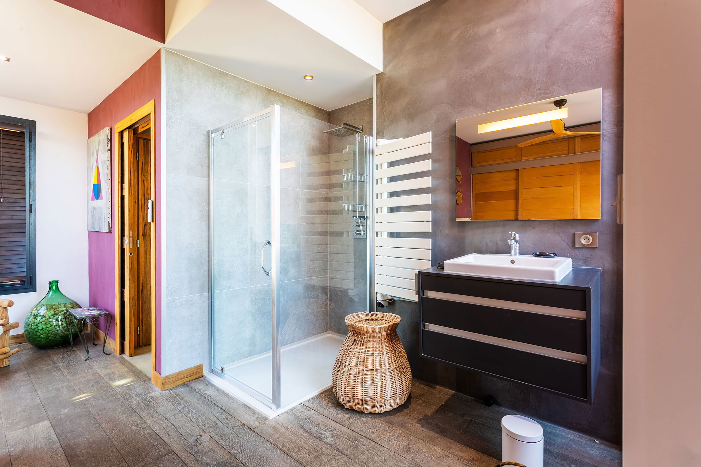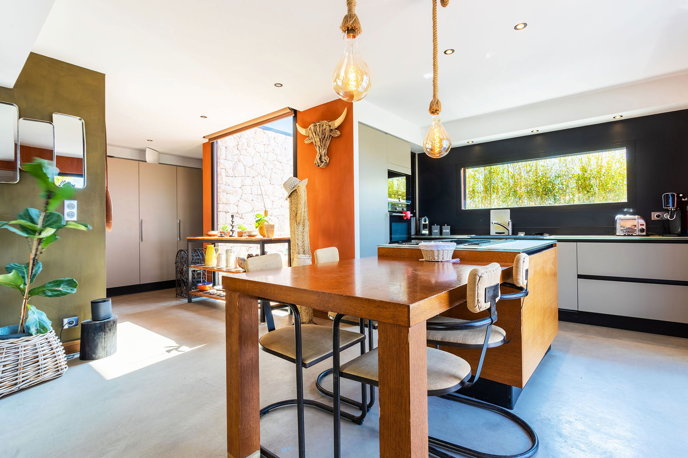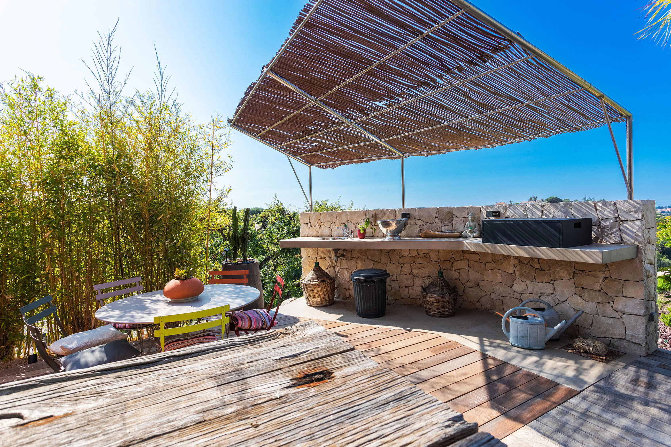 Teak terrace, garden, large plancha kitchen area, sink, wooden table for 10 people, chairs, parasols, deckchairs, aperitif cabin, ice machine, fridge and outdoor freezer,