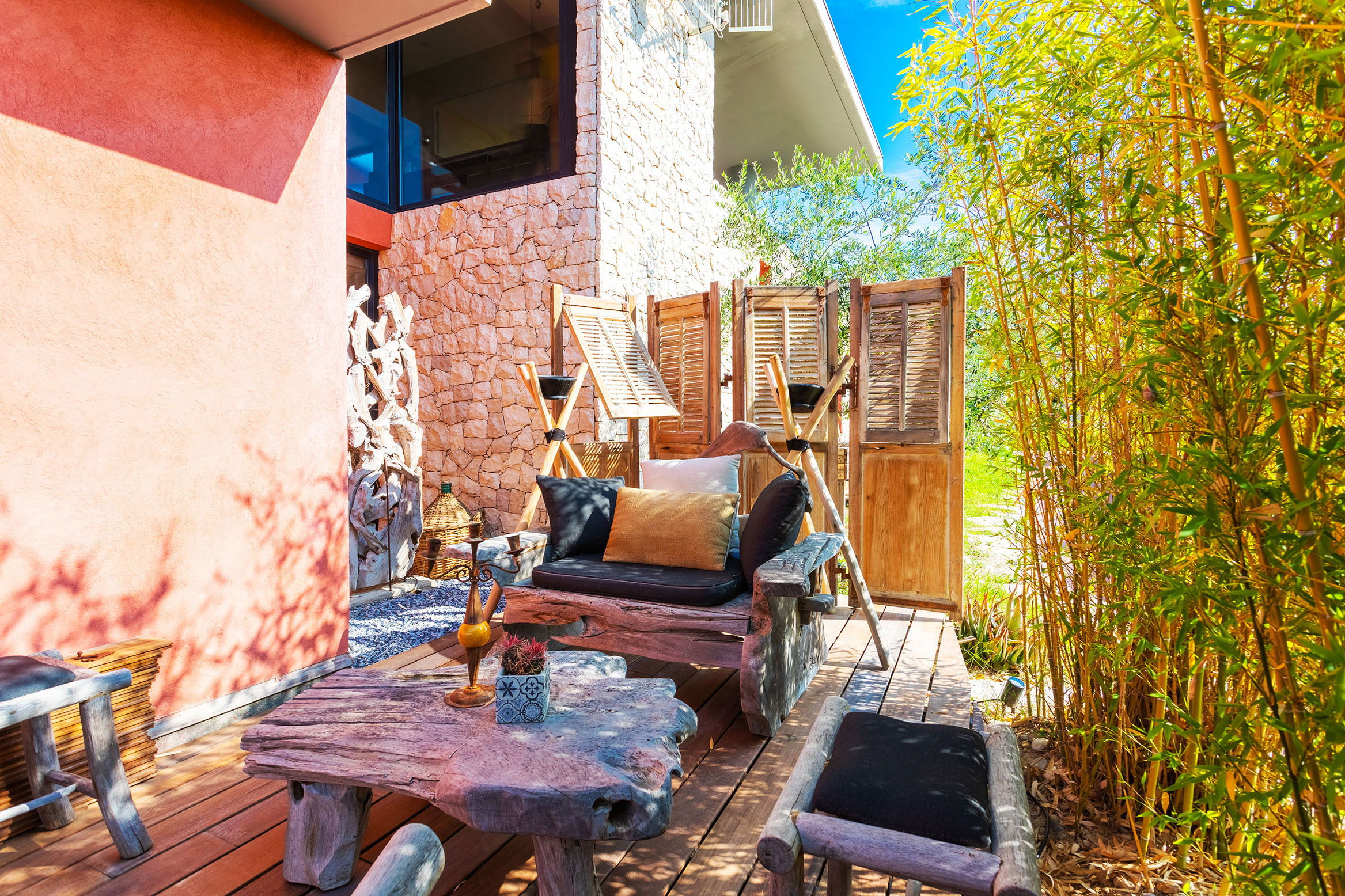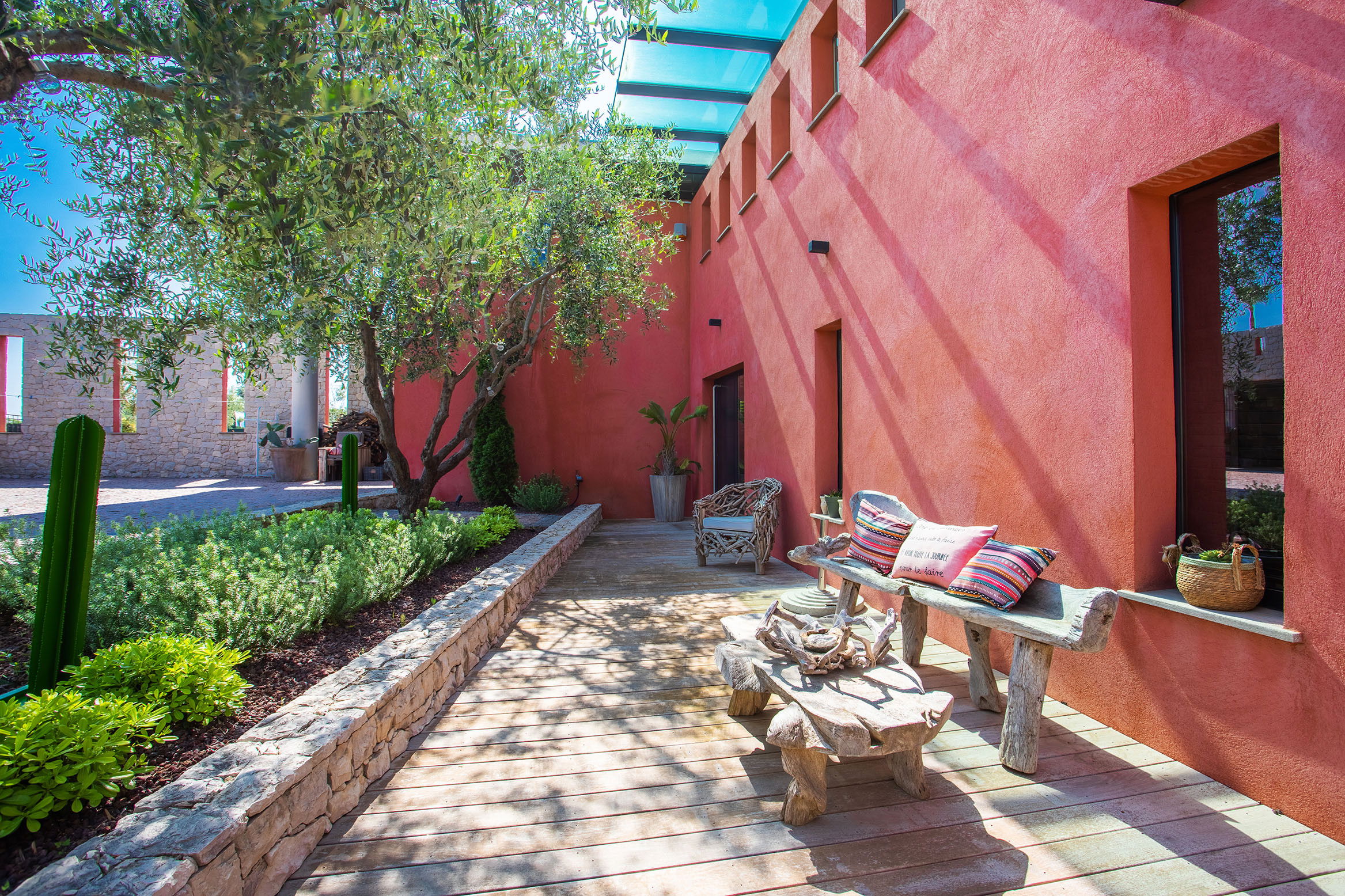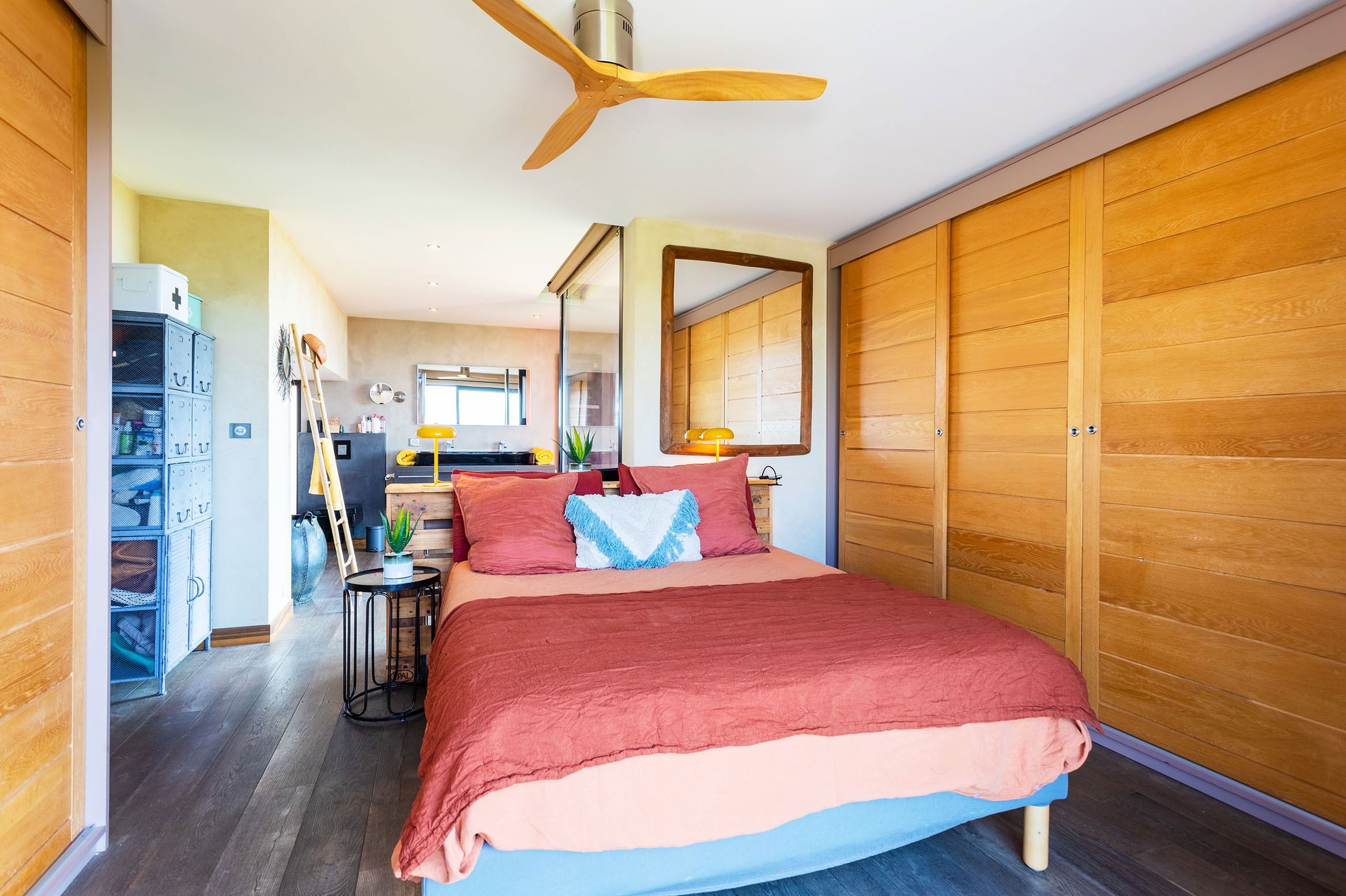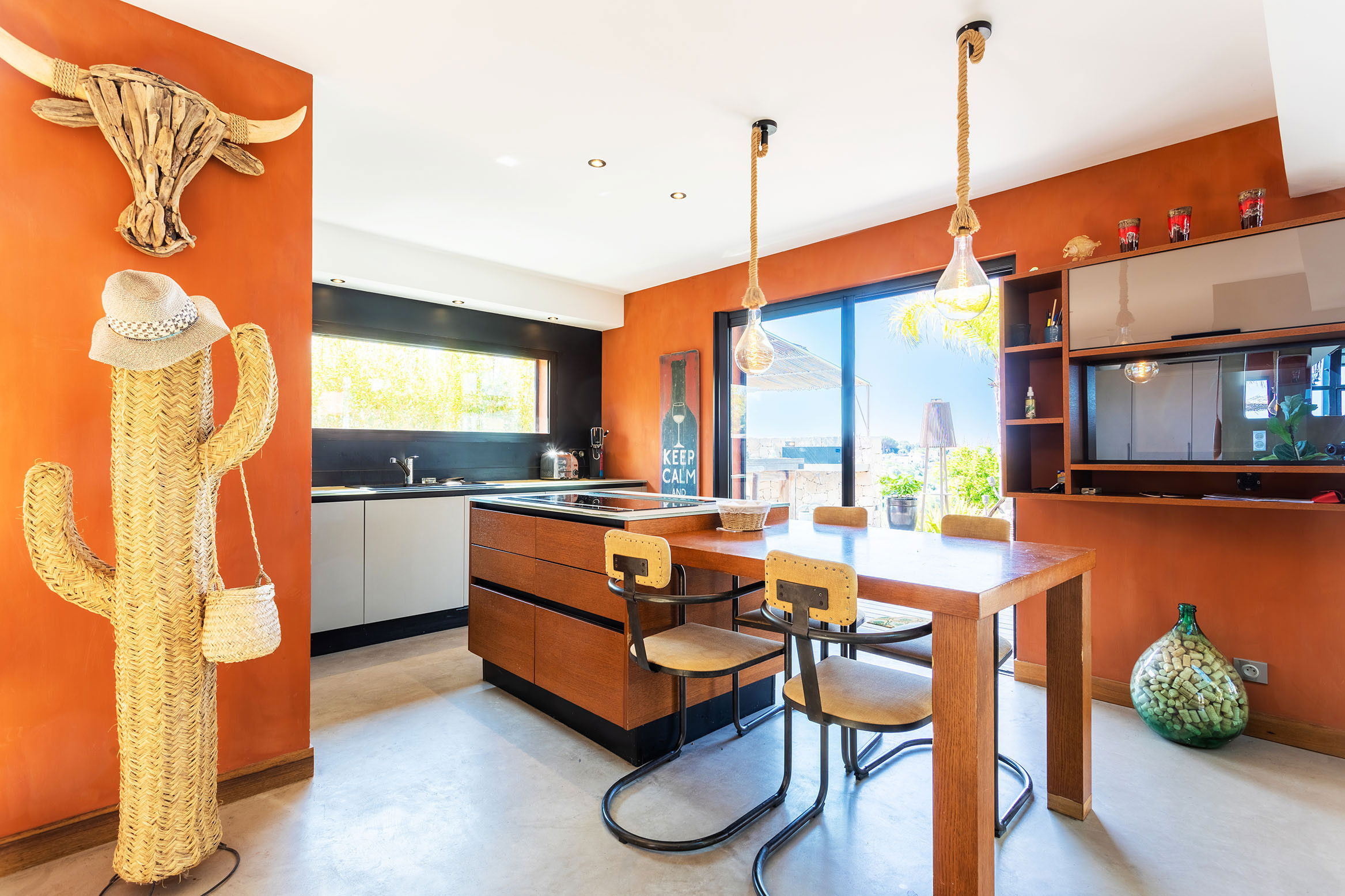 Teak terrace, garden, large plancha kitchen area, sink, wooden table for 10 people, chairs, parasols, deckchairs, aperitif cabin, ice machine, fridge and outdoor freezer,