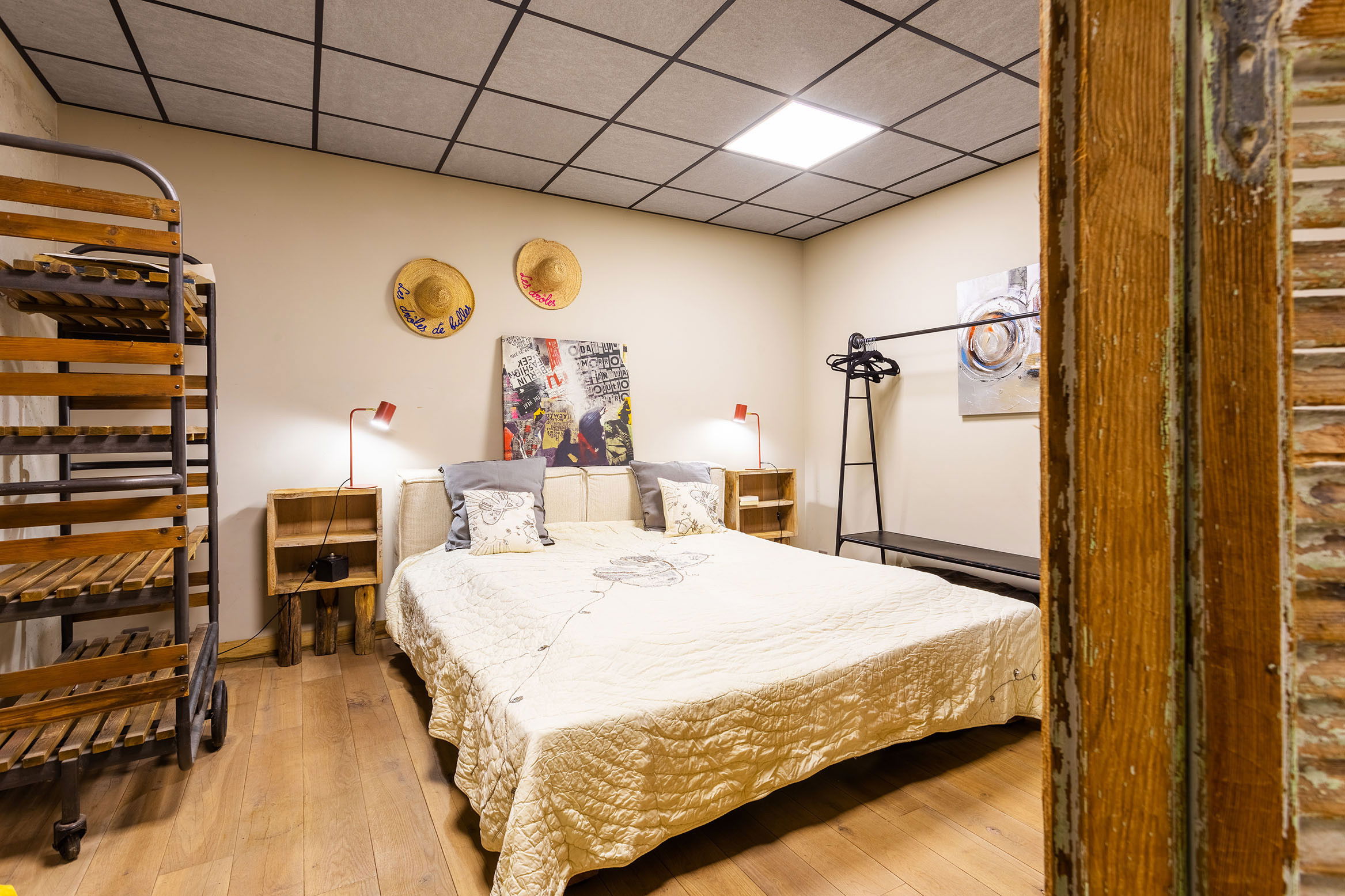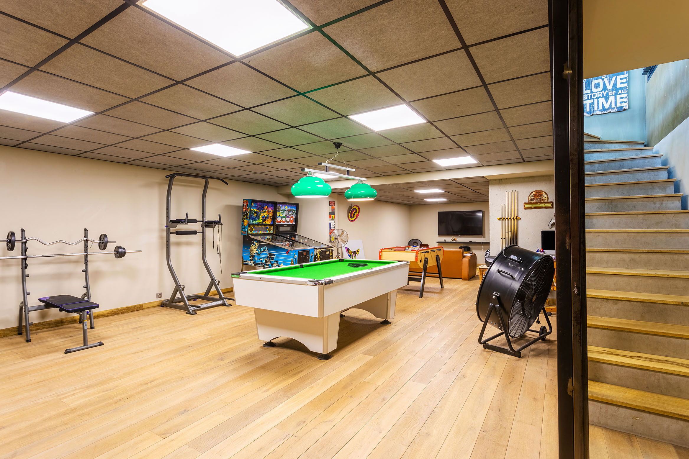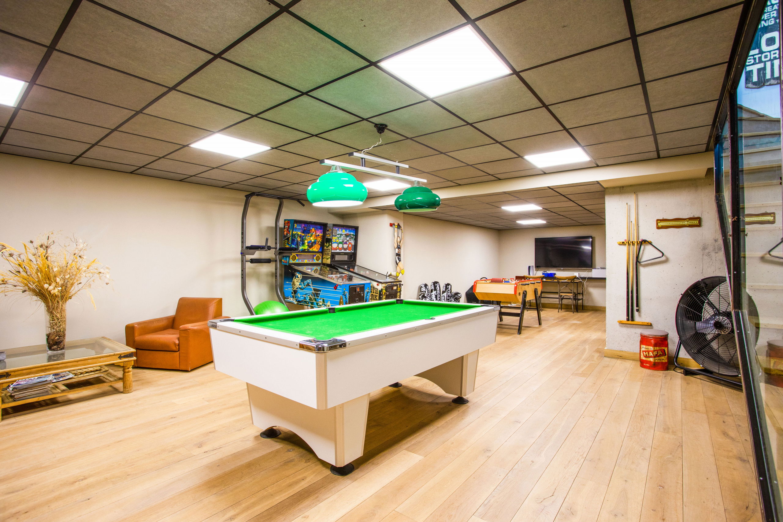 - in the basement, billiard games room, table football, weight machines, pinball machine, TV, laundry room and extra bed 160.