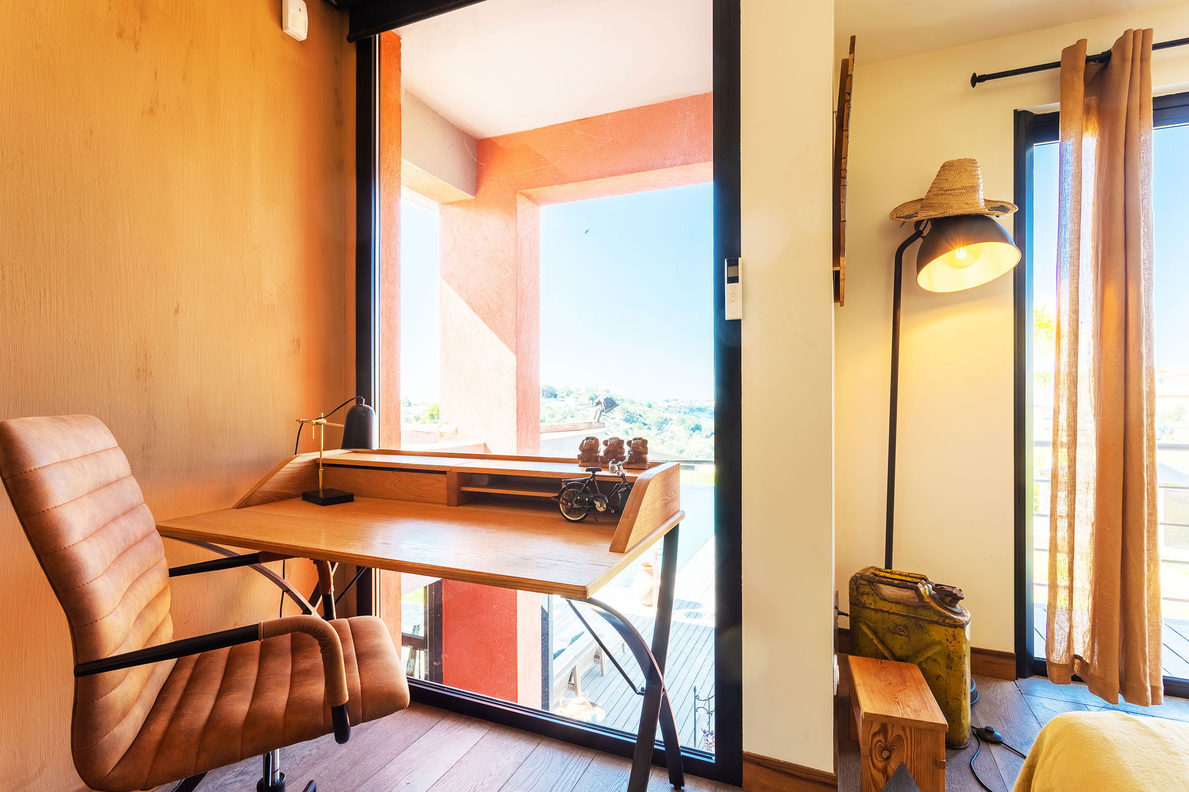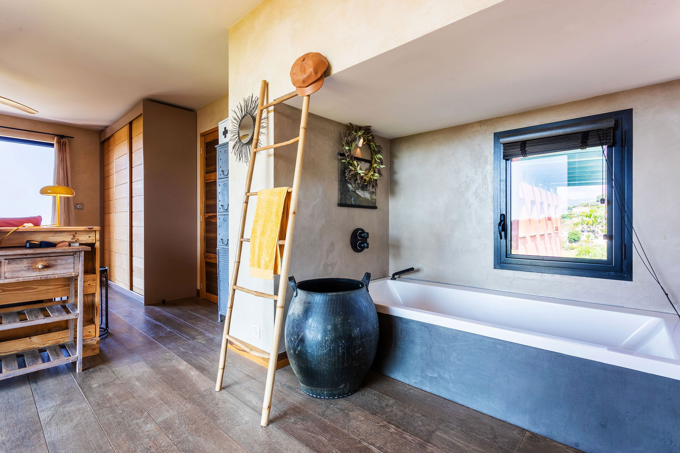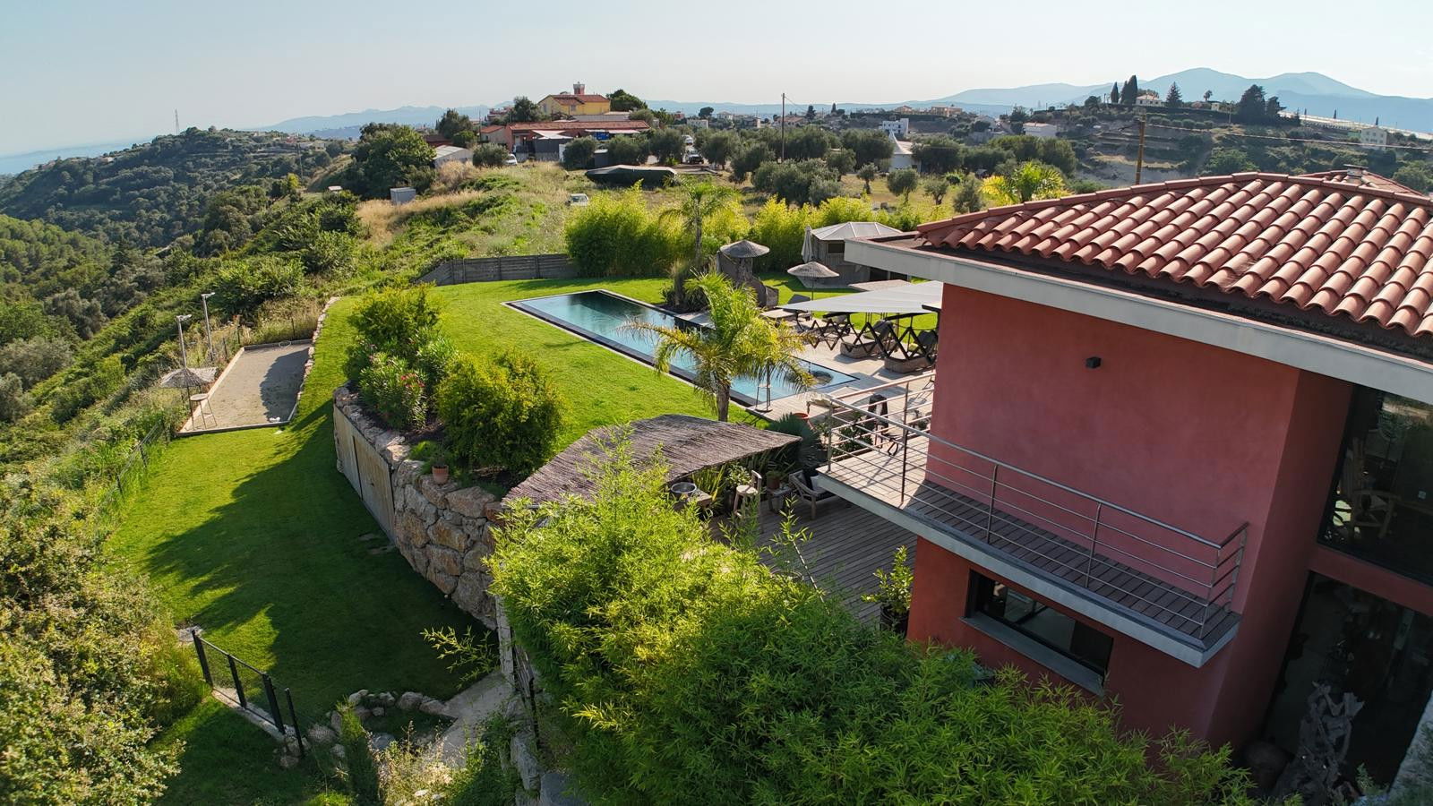 - upstairs: 2 suites each with a 160 bed, dressing room, toilet, shower and bath and one with office completely unobstructed view of the sea and mountains and the garden and swimming pool of the property