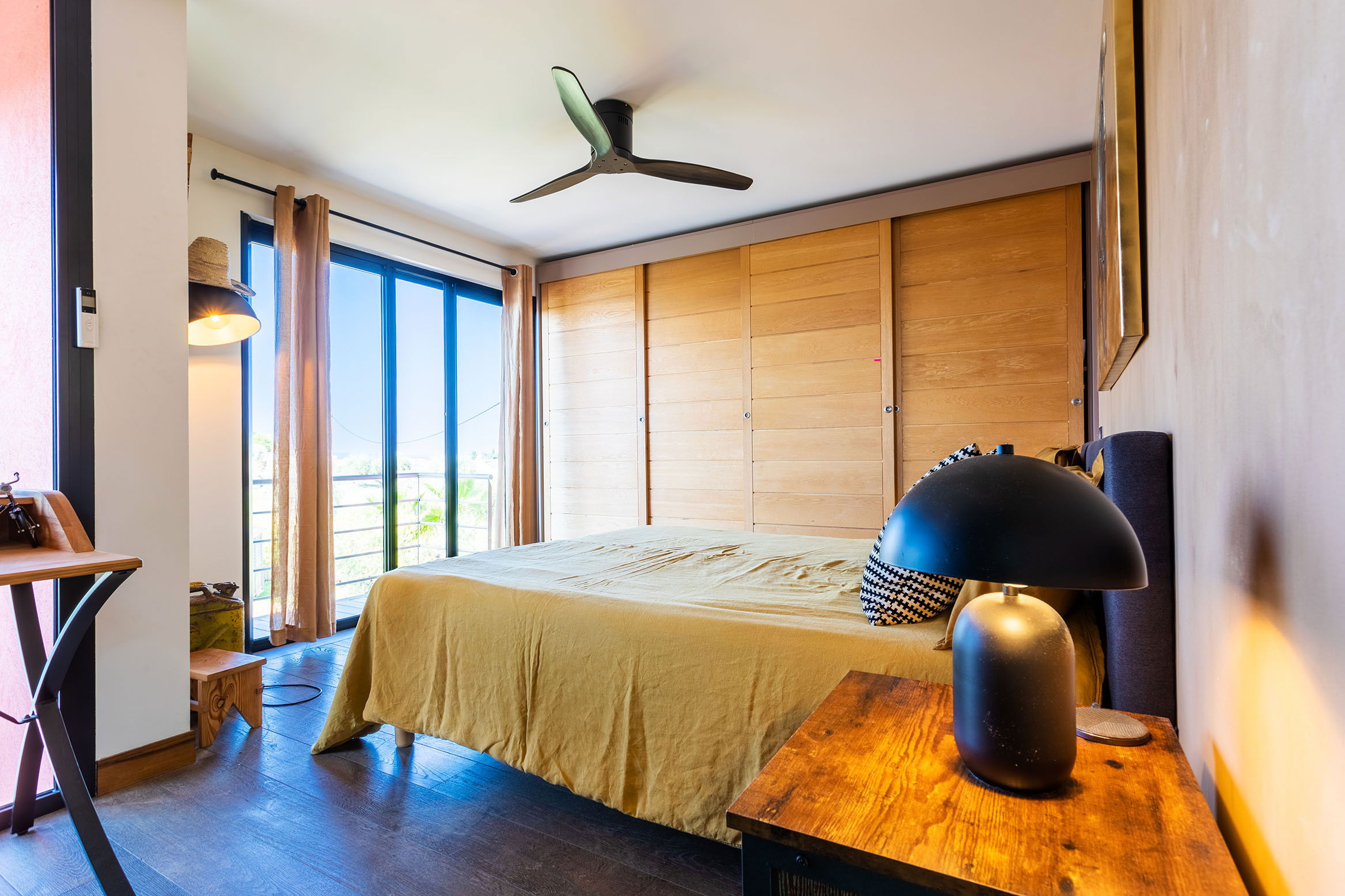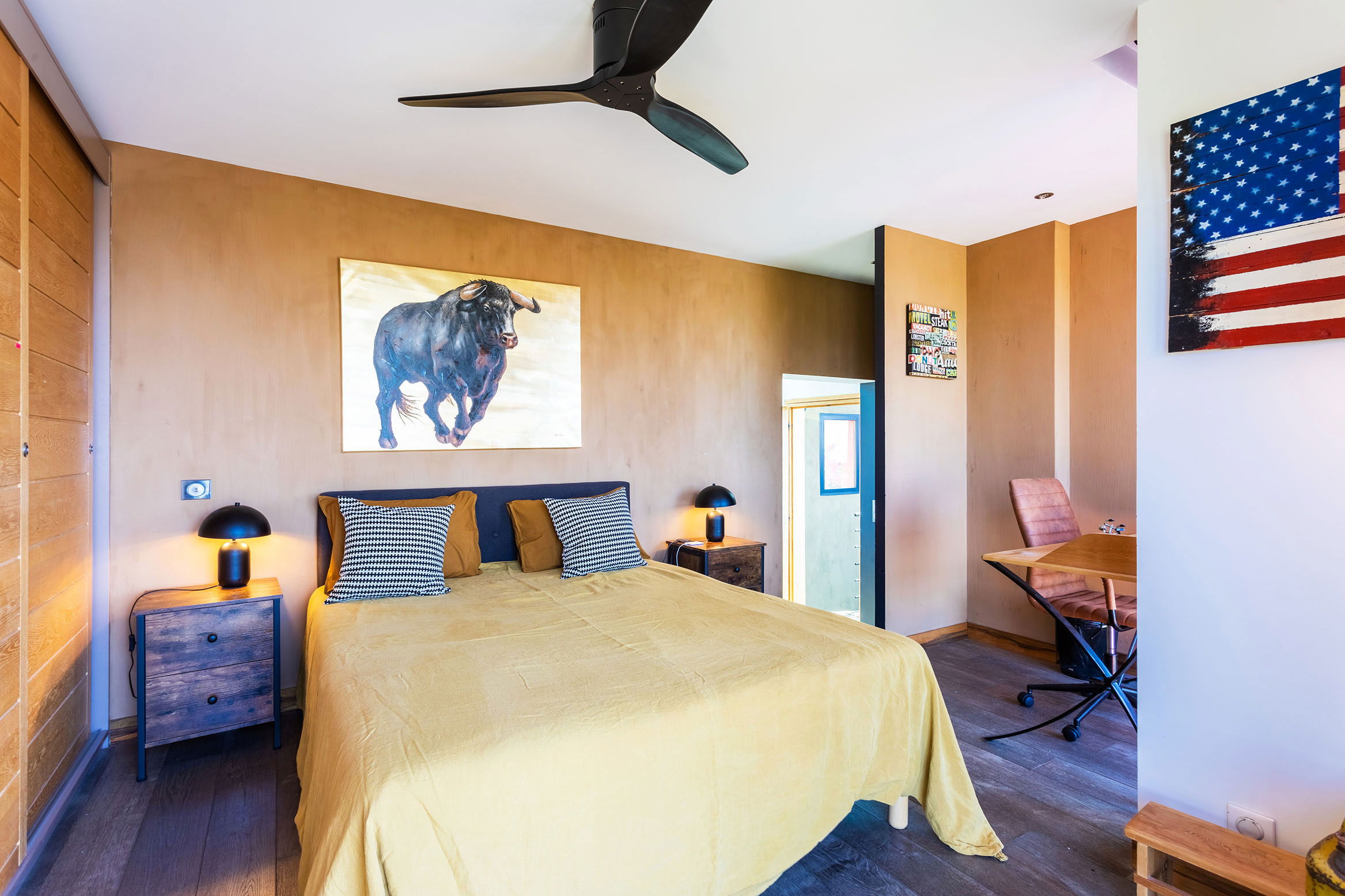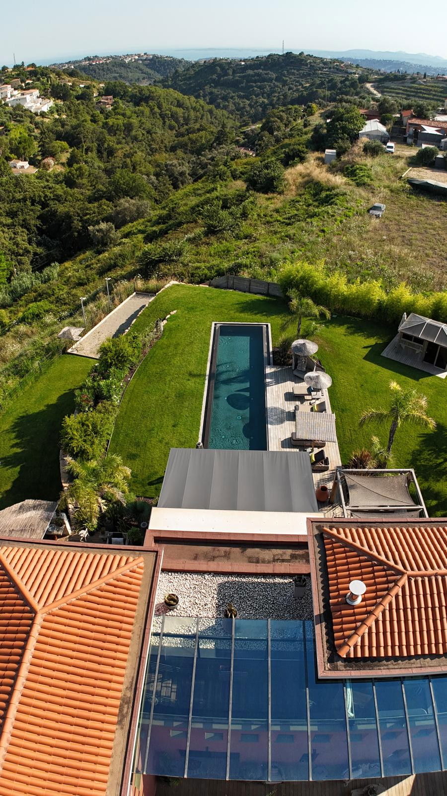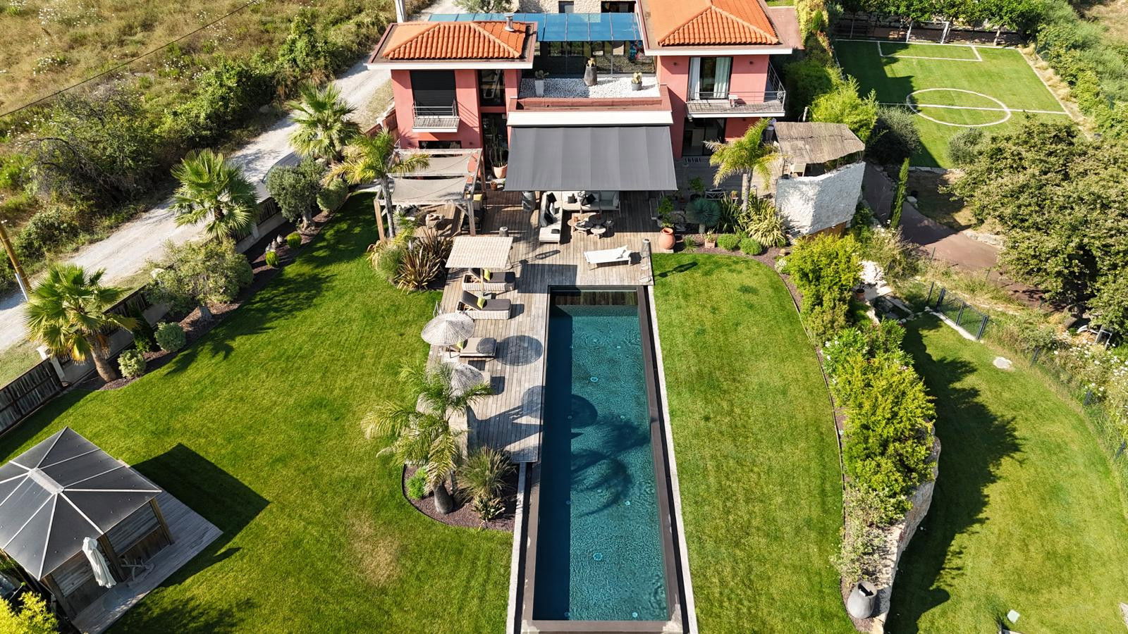 - upstairs: 2 suites each with a 160 bed, dressing room, toilet, shower and bath and one with office completely unobstructed view of the sea and mountains and the garden and swimming pool of the property