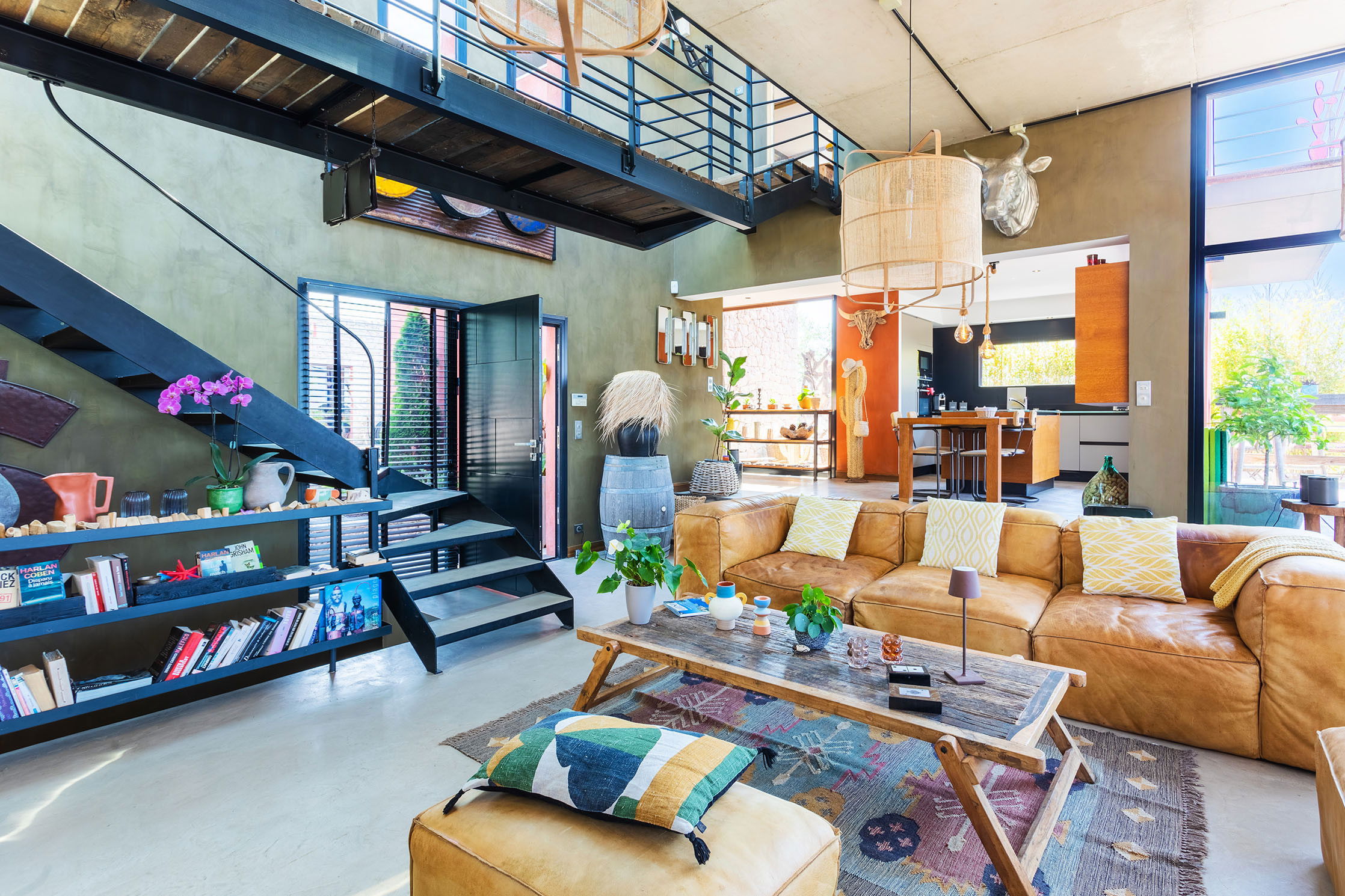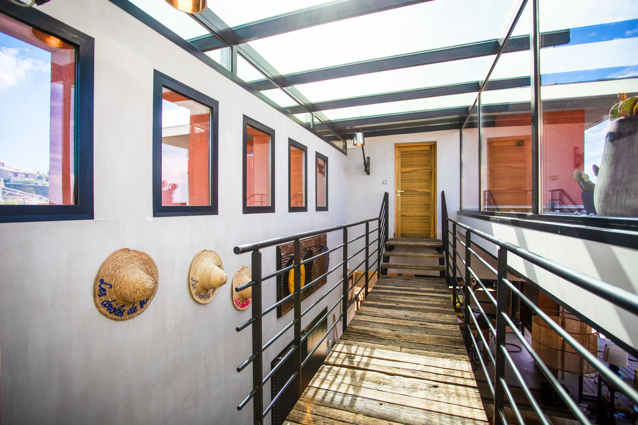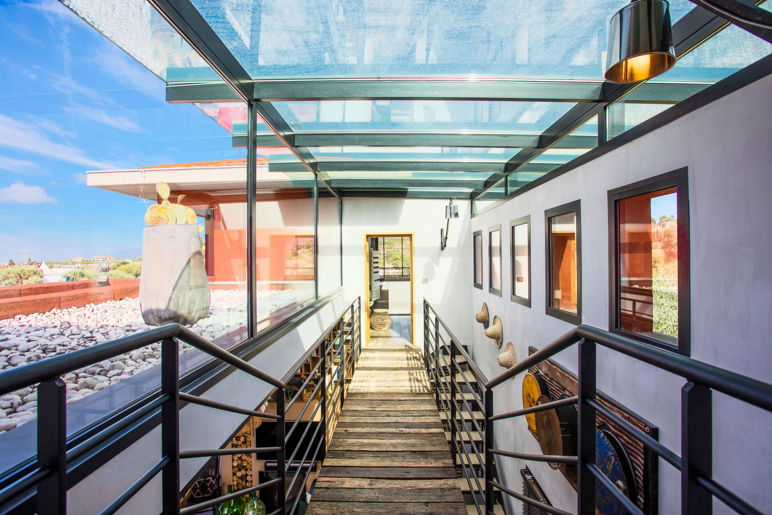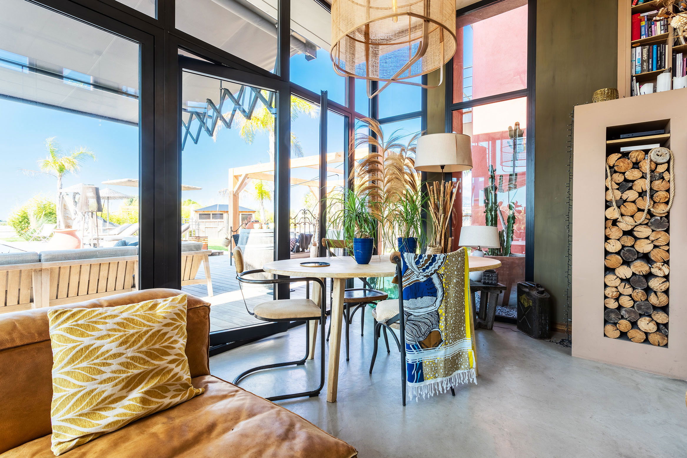 House fitted out by an interior decorator with a southern spirit, large bay window, part of the glass roof.