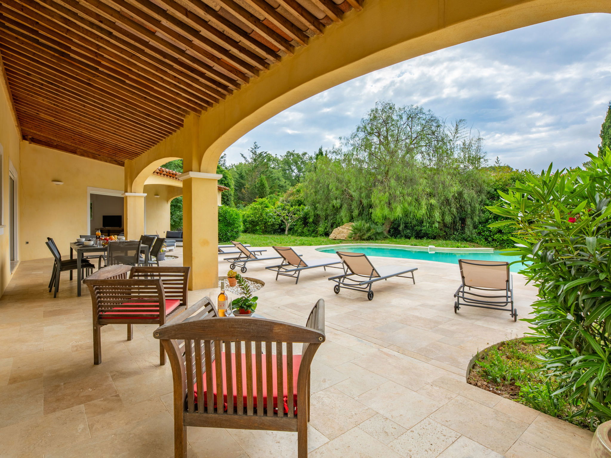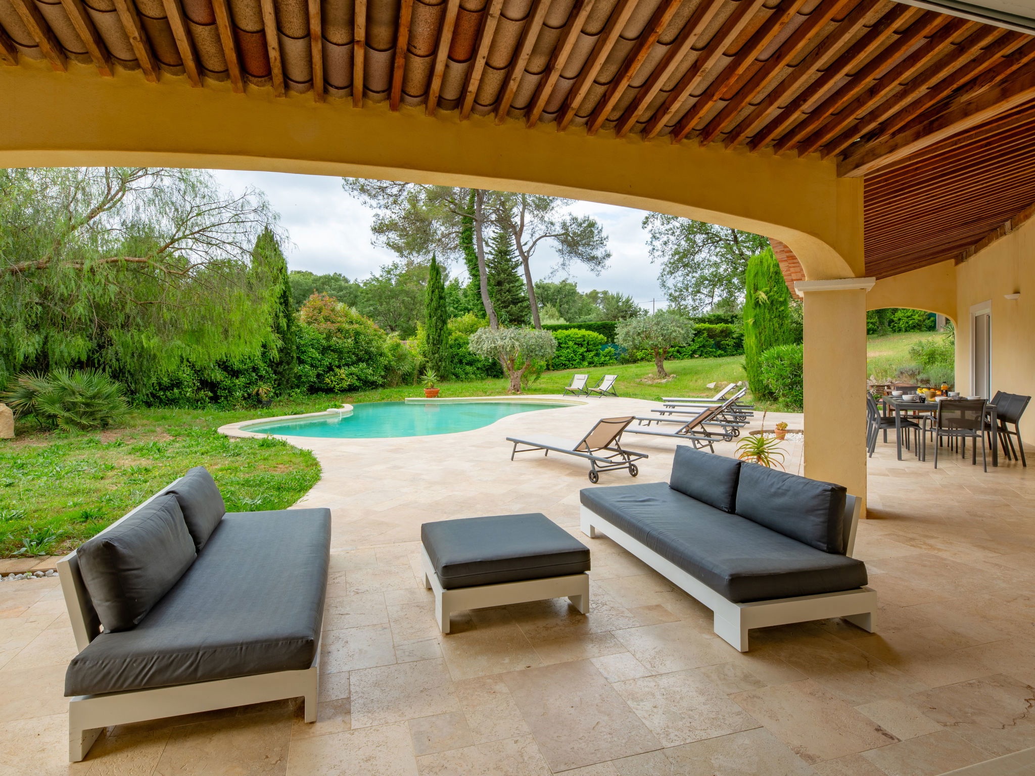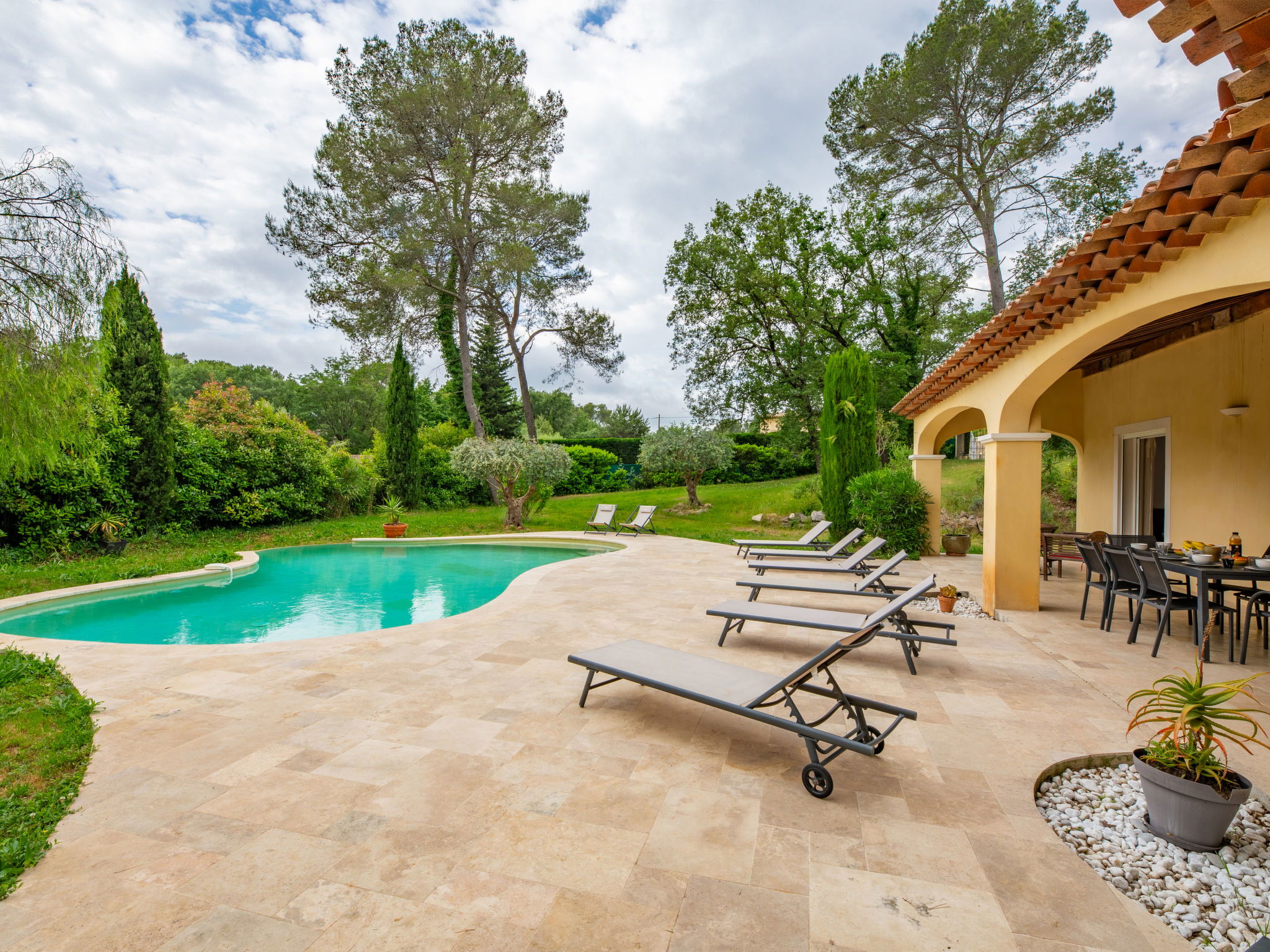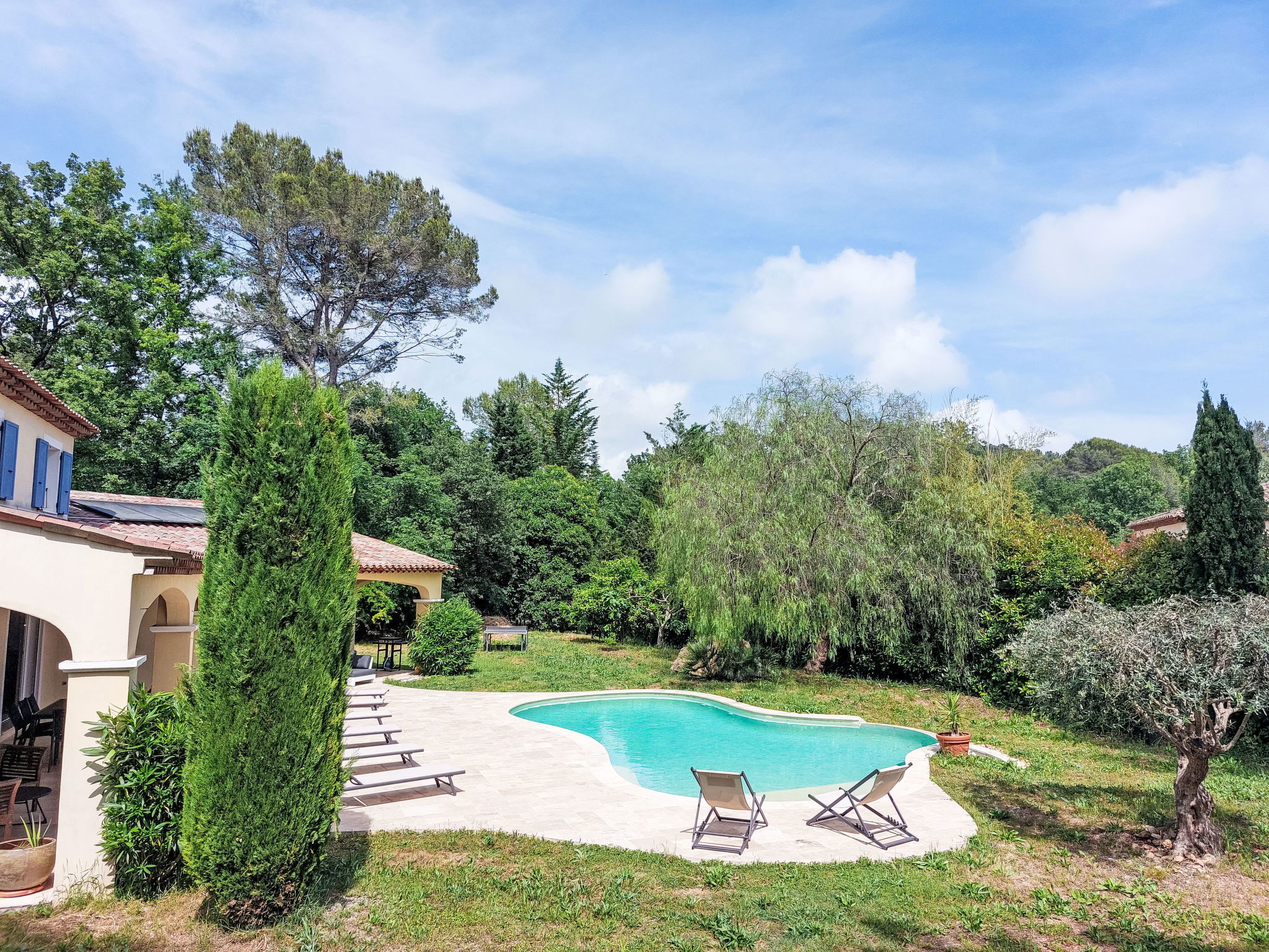 Large, comfortable single-family house "La Pimaleanne", 2 storeys. Outside the resort, 4 km from the centre of Roquefort-les-Pins, residential area (villas), in a cul-de-sac. Private: property 2'200 m2 (fenced), swimming pool (10 x 5 m, depth 150 cm, seasonal availability: 01.Apr. - 31.Oct.) with alarm system and salt-electrolysis pool-cleaning system. Table tennis, parking (for 2 cars), single garage. Shop 2 km, supermarket 3.5 km, restaurant 2 km, bus stop 2 km, shingle beach 16 km. Golf course (18 hole) 7 km. Nearby attractions: Grasse 13 km, Cannes 22 km, Nice 27 km. The owner does not accept any youth groups.